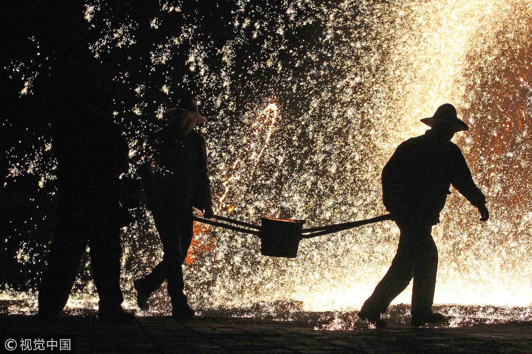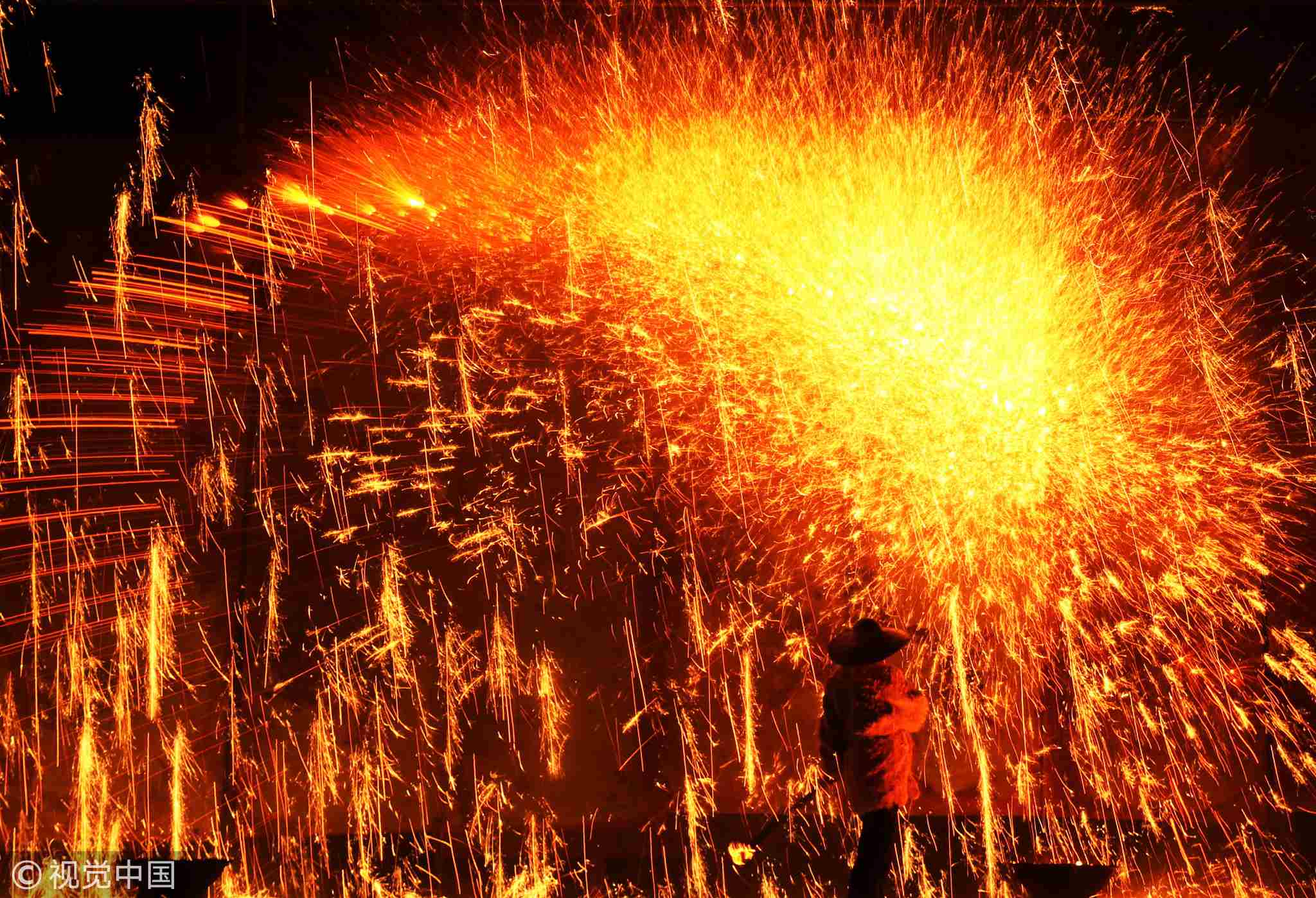 As a master pours a spoonful of liquid iron with more than 1,600 degrees Celsius over the wall, the pearly golden and red drops burst into a shower of golden sparks, like little umbrellas, making the viewers marvel at the amazing scenery.