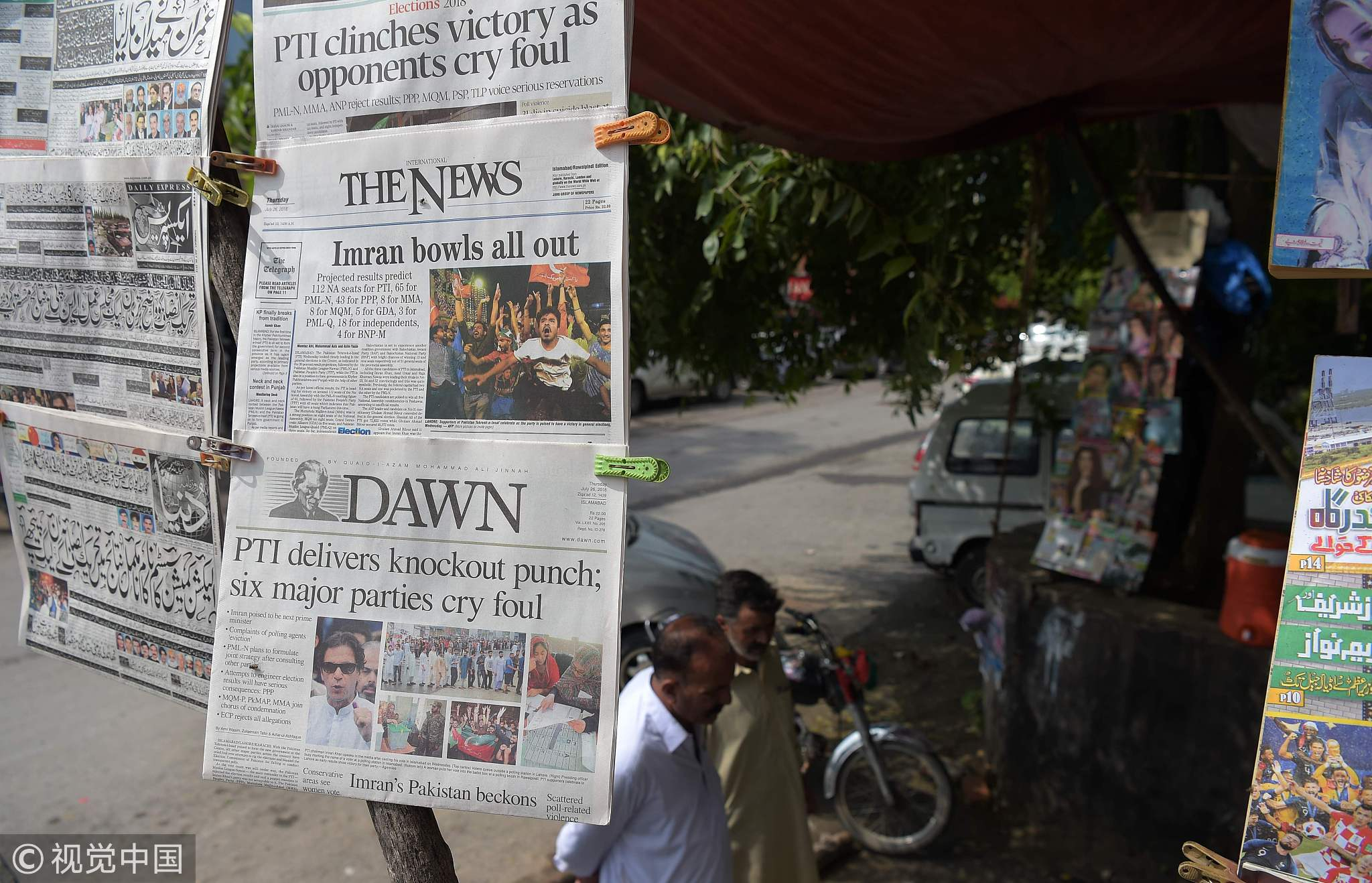 Pakistani residents read morning newspapers at a stall a day after the general election in Islamabad on July 26, 2018. /VCG Photo