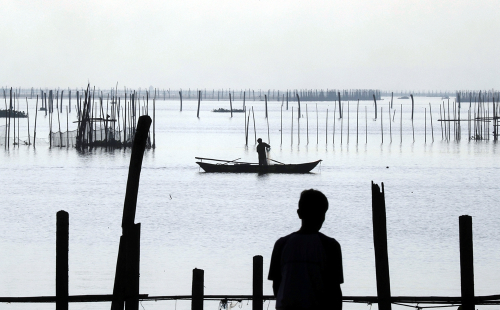 A worker recovers net in a fish pen before Super Typhoon Mangkhut hits the main island of Luzon, the Philippines on September 13, 2018. /VCG Photo