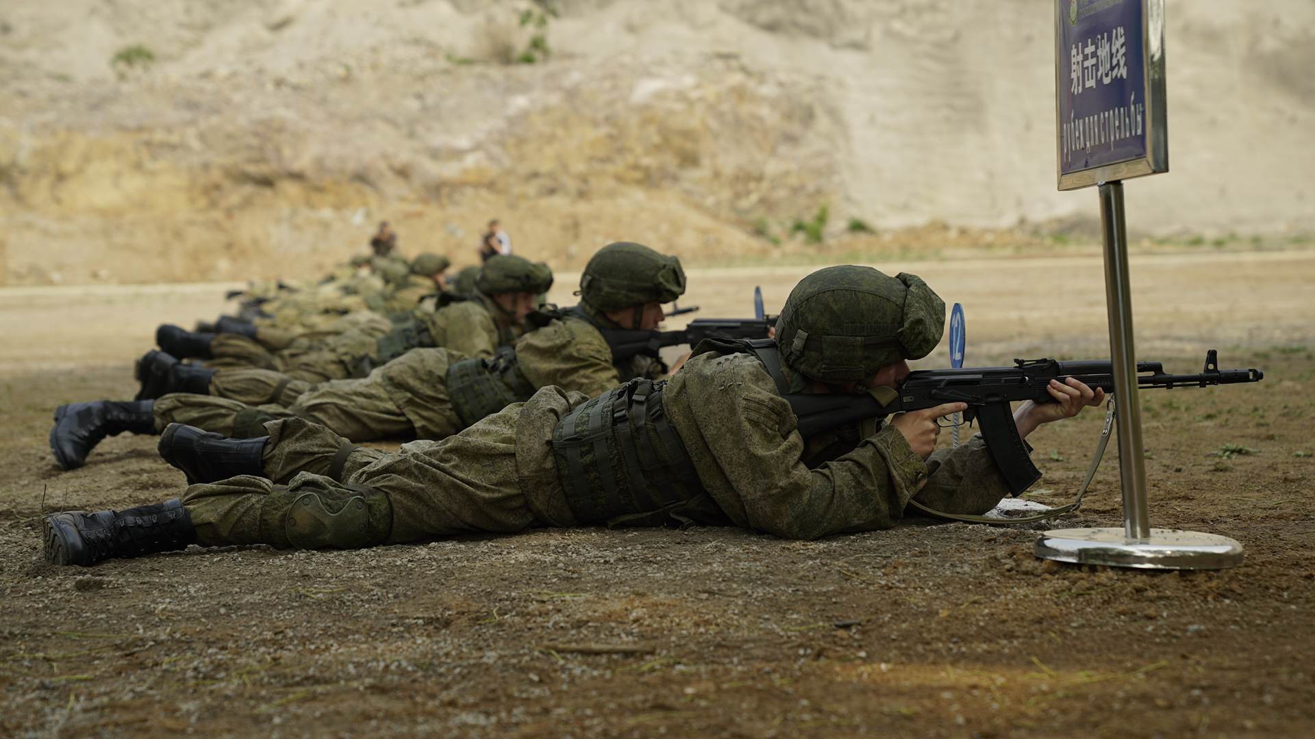 Russian soldiers in shooting program in the land competitions of “Joint Sea-2019” exercise held by Chinese and Russian navies, April 30. /CGTN Photo