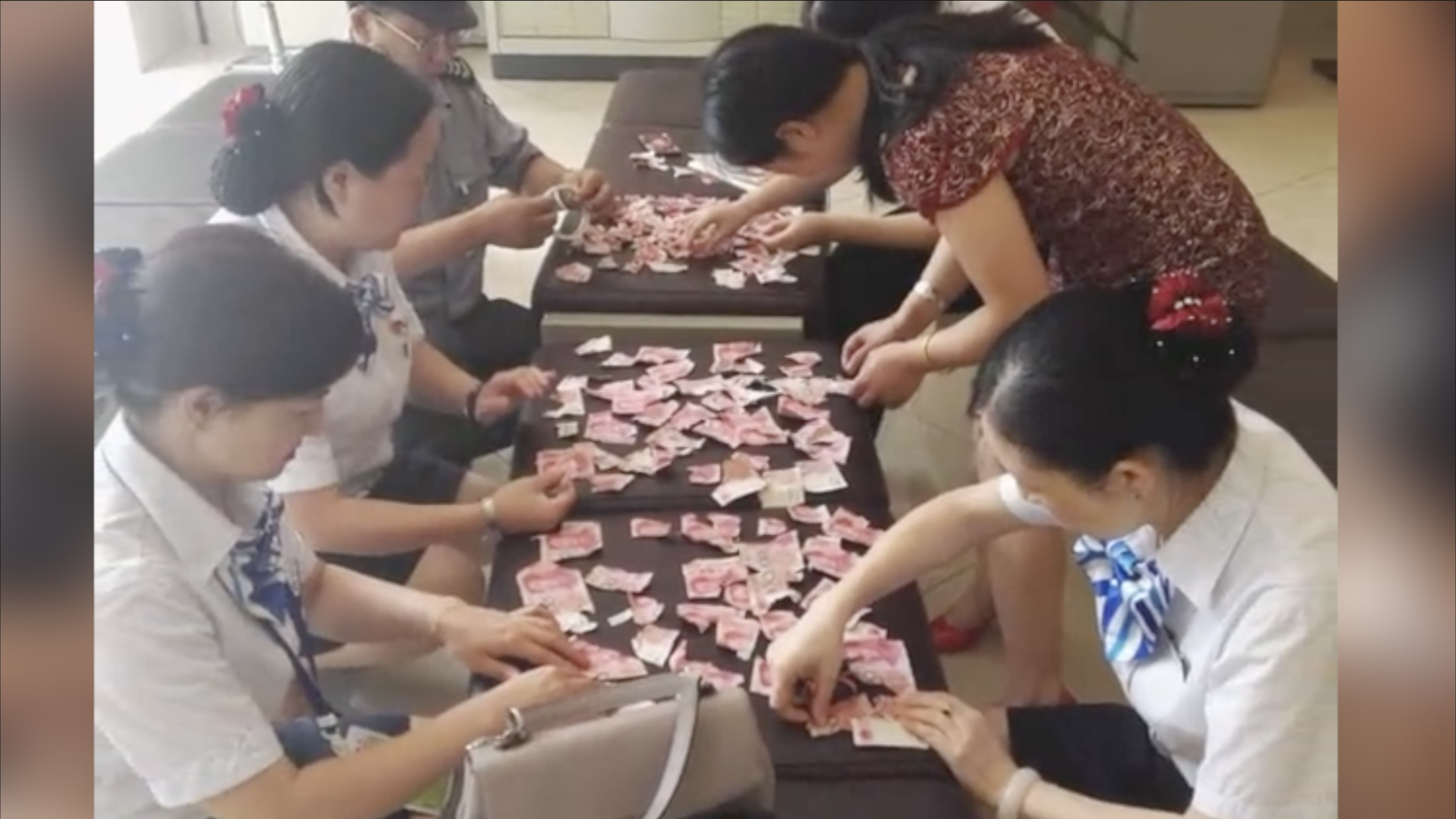 An old man with Alzheimer's disease ripped 6,000 yuan (875 US dollars) worth of banknotes into pieces in southwest China’s Deyang City. The money was for the elderly man's treatment. His family asked the local bank to exchange the mangled money and both the bank staff and benevolent customers successfully spliced 5,450 yuan (794 US dollars) back together.