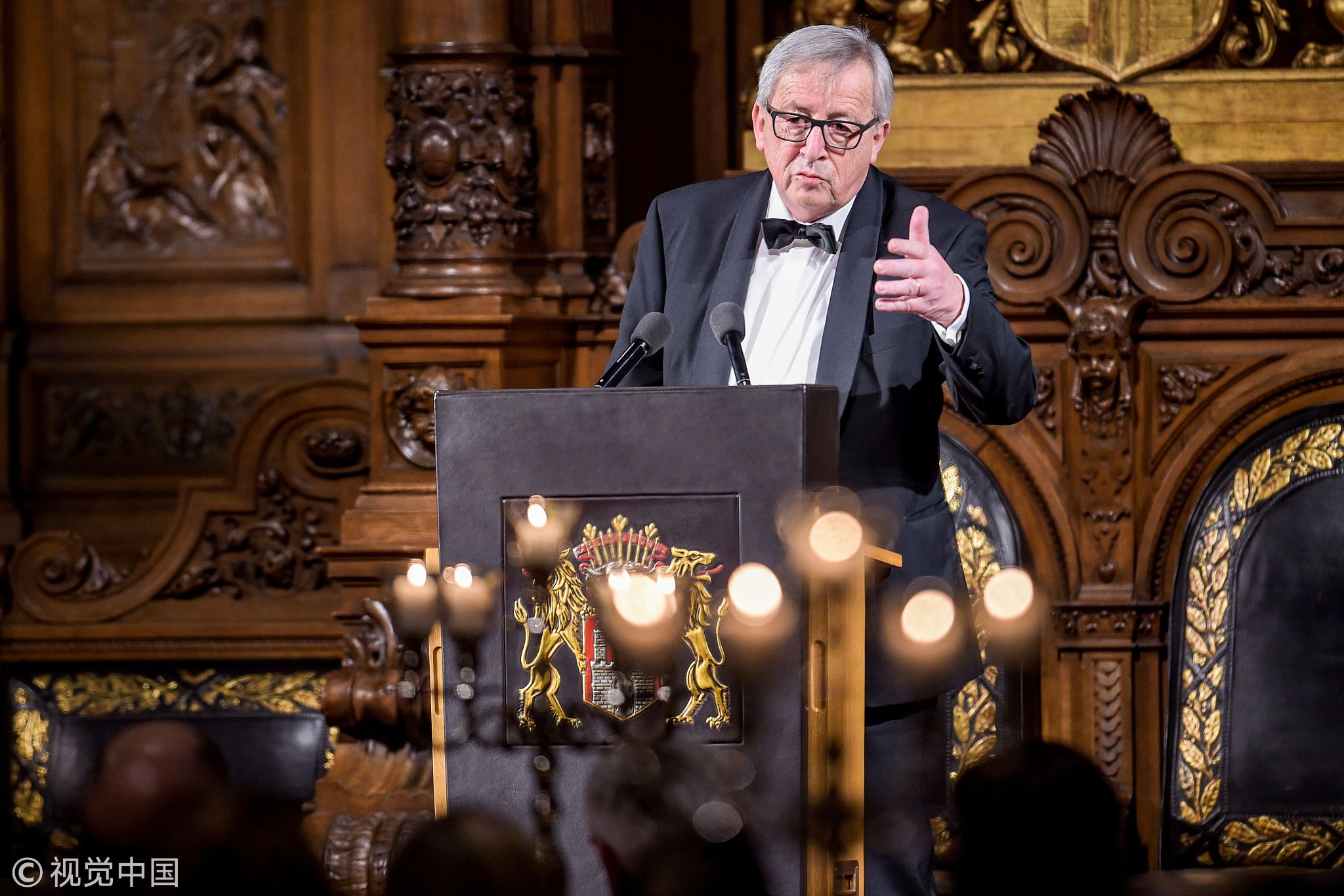 European Commission chief Jean-Claude Juncker gives a speech during the traditional Matthiae-Mahl dinner on March 2, 2018 at the City Hall in Hamburg, northern Germany. /VCG Photo.