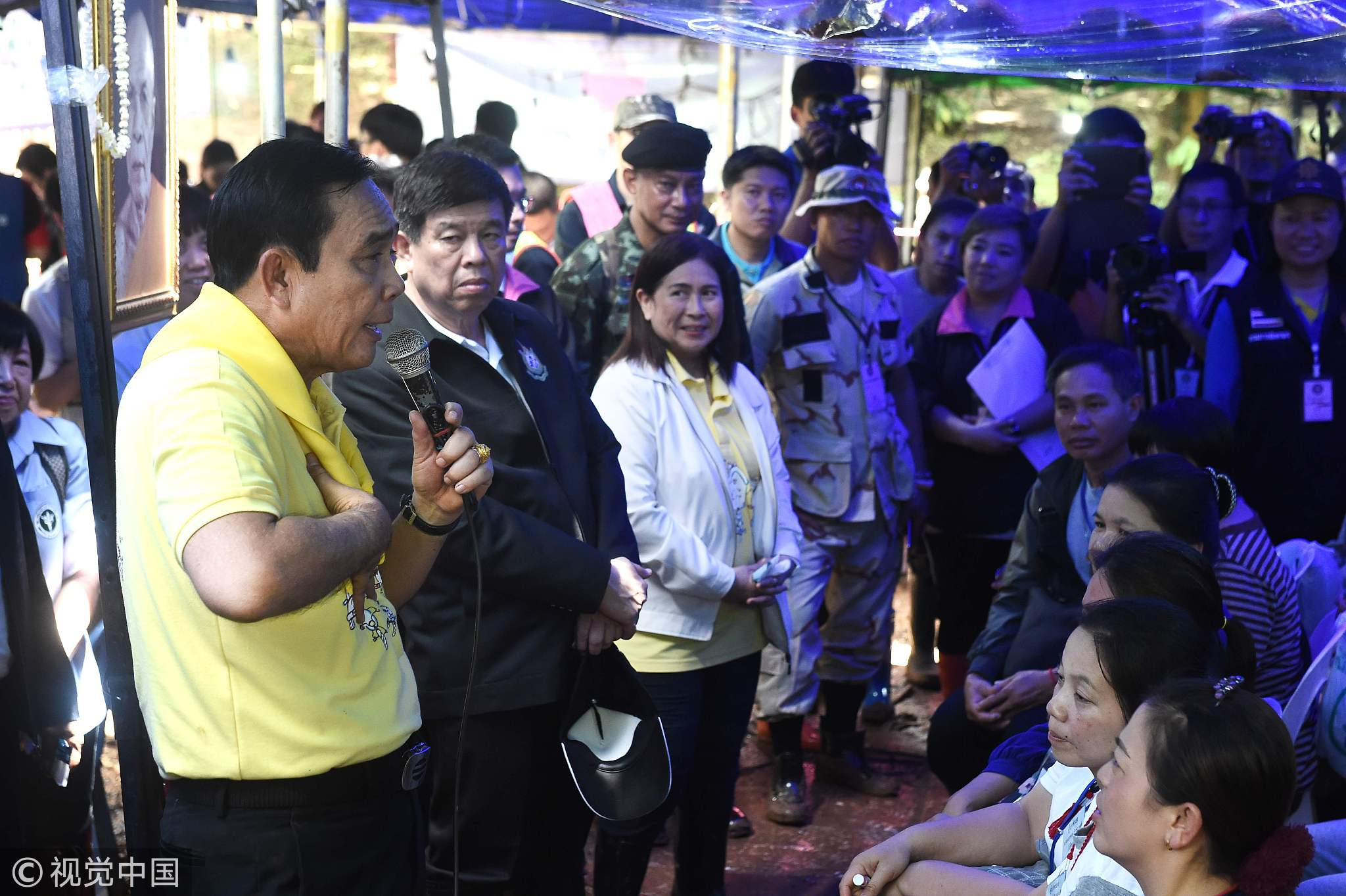 Thai Prime Minister Prayut Chan-O-Cha (L) speaks to family members of missing children and their coach camping out at Khun Nam Nang Non Forest Park in Chiang Rai province, June 29, 2018 during rescue operation in Tham Luang cave. /VCG Photo