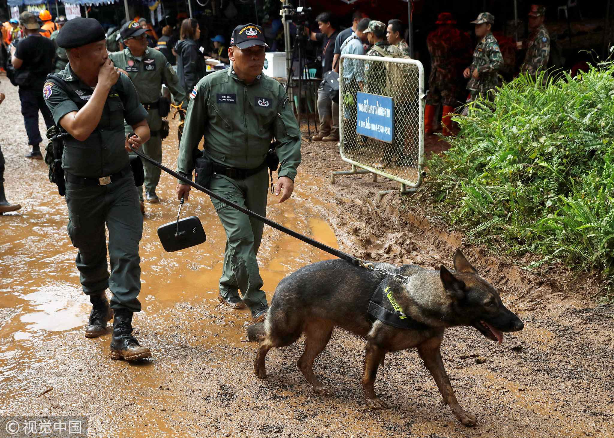 Soldiers walk with a dog near the Tham Luang cave complex, as a search for members of an under-16 soccer team and their coach continues, in the northern province of Chiang Rai, on June 29, 2018. /VCG Photo