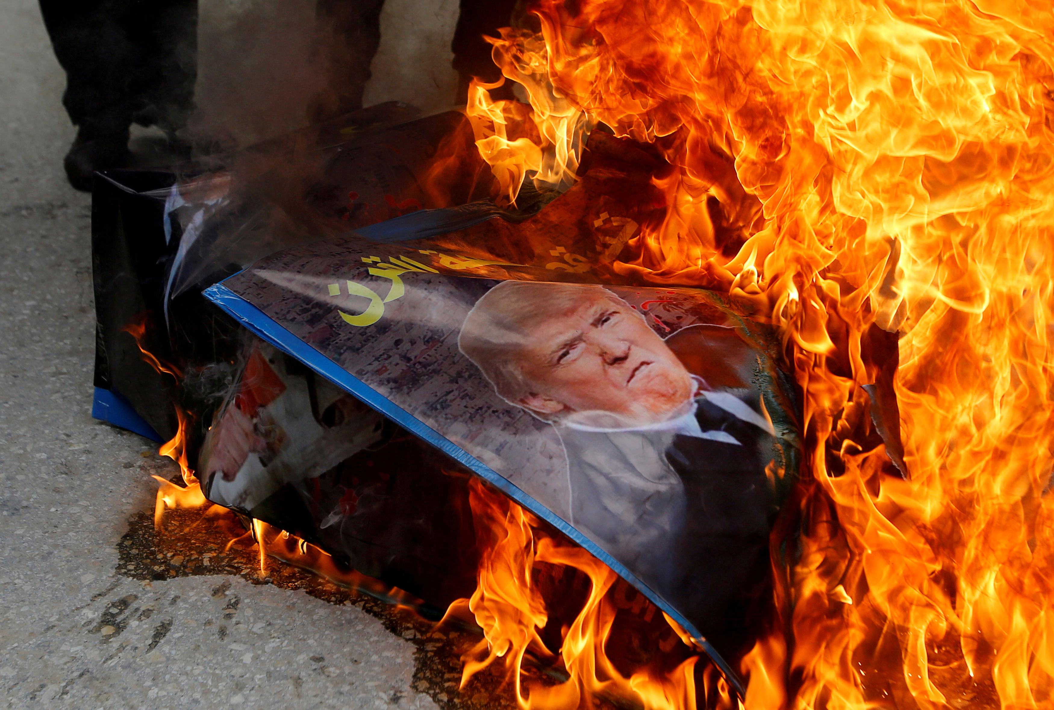 Palestinian demonstrators burn a poster depicting U.S. President Donald Trump during a protest calling for opening Shuhada Street, which Israel unilaterally closed in 1994, in Hebron, in the Israeli-occupied West Bank, February 22, 2019. /Reuters Photo