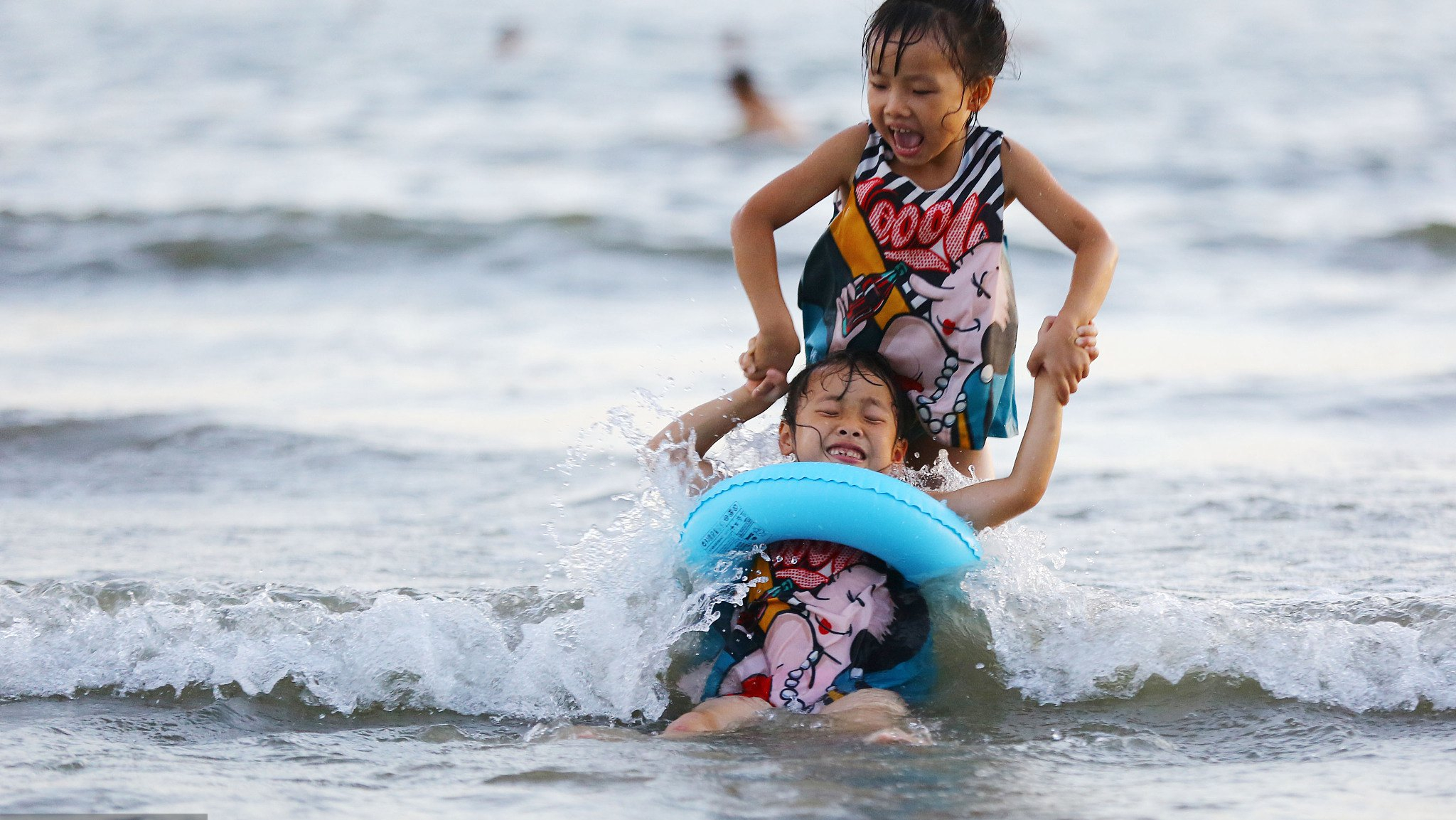 Two kids have fun on the beach, August 1, 2018, in Sanya, southern China. /VCG. Photo.