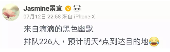 “Dark humor from Didi: currently 226 people in queue, the car is estimated to reach the destination sometime tomorrow,” wrote Weibo user @Jasminejingyi.