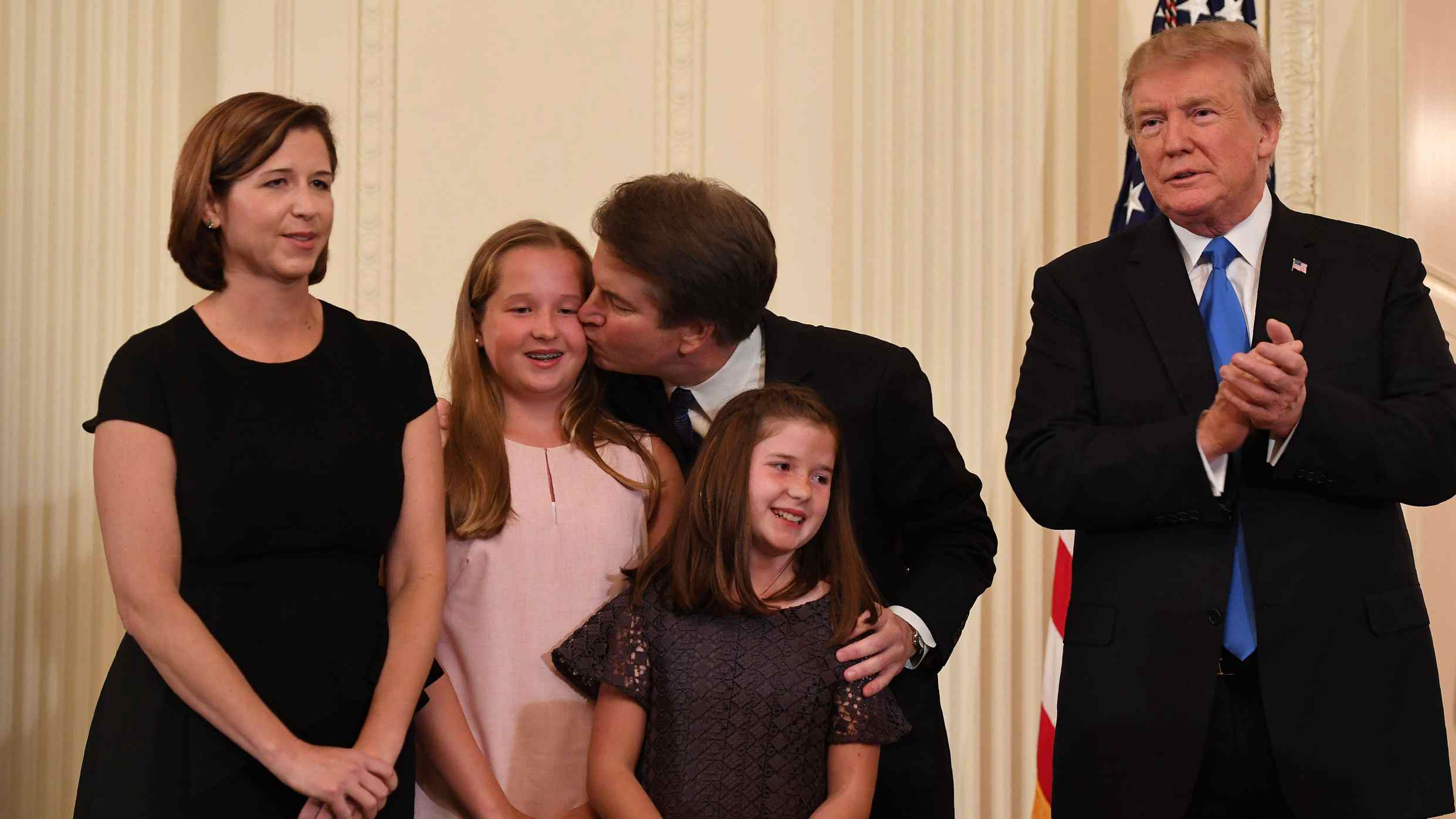 US President Donald Trump (R) claps as Brett Kavanaugh kisses one of his daughters after being nominated to the Supreme Court in the East Room of the White House on July 9, 2018 in Washington, DC. /VCG Photo