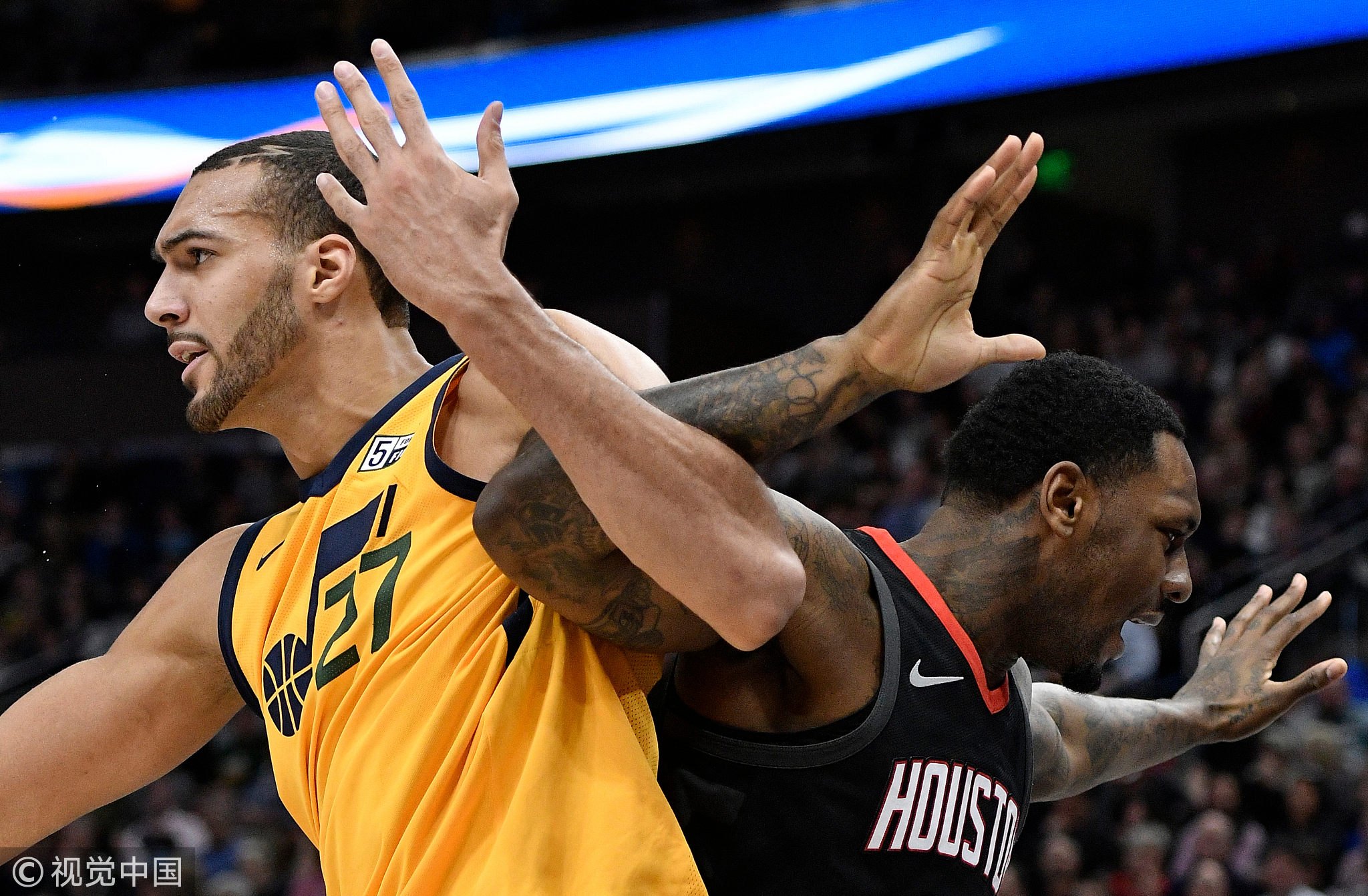 December 7, 2017: Gobert #27 of the Utah Jazz and Tarik Black #28 of the Houston Rockets get tangled up under the basket in the second half of the 112-101 win by the Rockets at Vivint Smart Home Arena in Salt Lake City, Utah. /VCG Photo