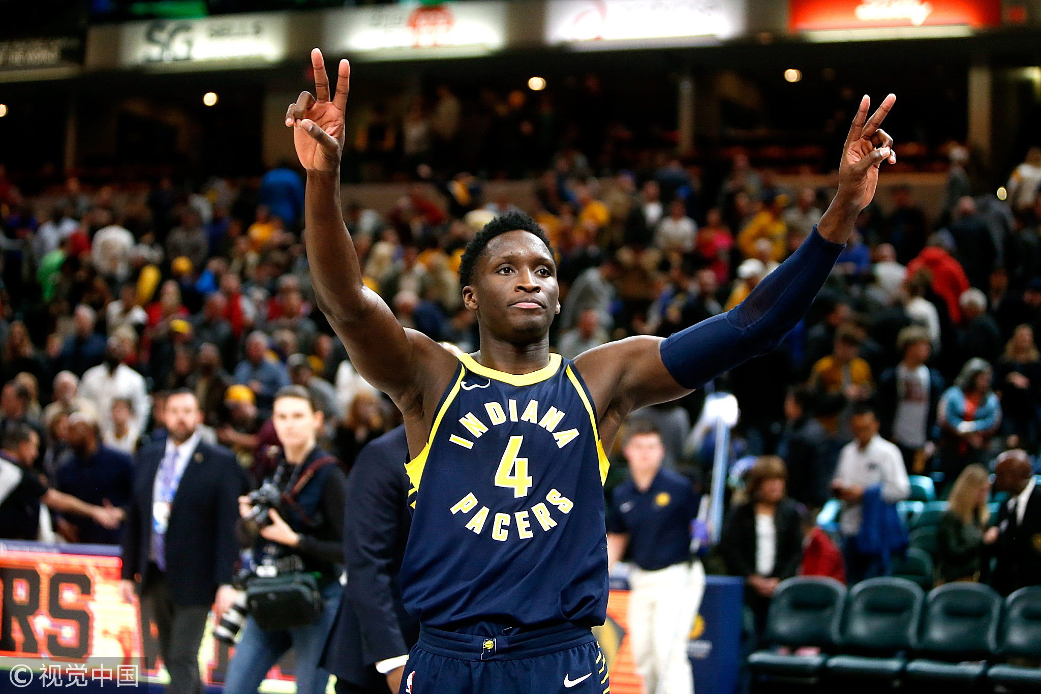 December 23, 2017: Victor Oladipo #4 of the Indiana Pacers motions goodbye to the crowd after defeating the Brooklyn Nets in overtime at Bankers Life Fieldhouse in Indianapolis, Indiana. /VCG Photo