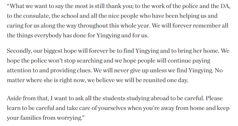 Zhang’s parents immediately traveled to the United States to look for their daughter upon hearing the news of her disappearance, and stayed there for five months before returning to China.
