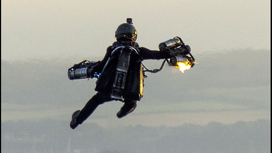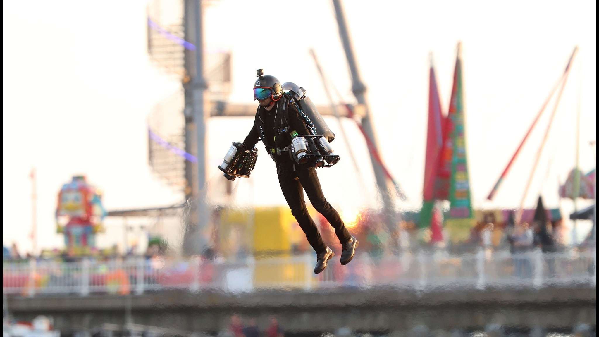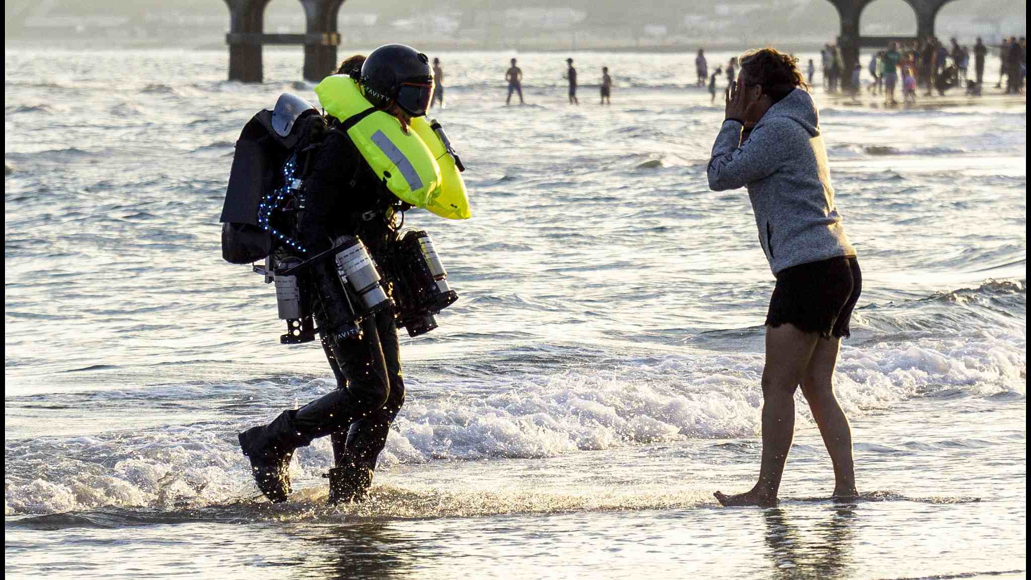 A daredevil in a James Bond-style jetpack accidentally plunged into the sea while showing it off during an air show in Bournemouth Dorset, the UK, after his equipment attached to his right arm caught fire. /VCG Photo