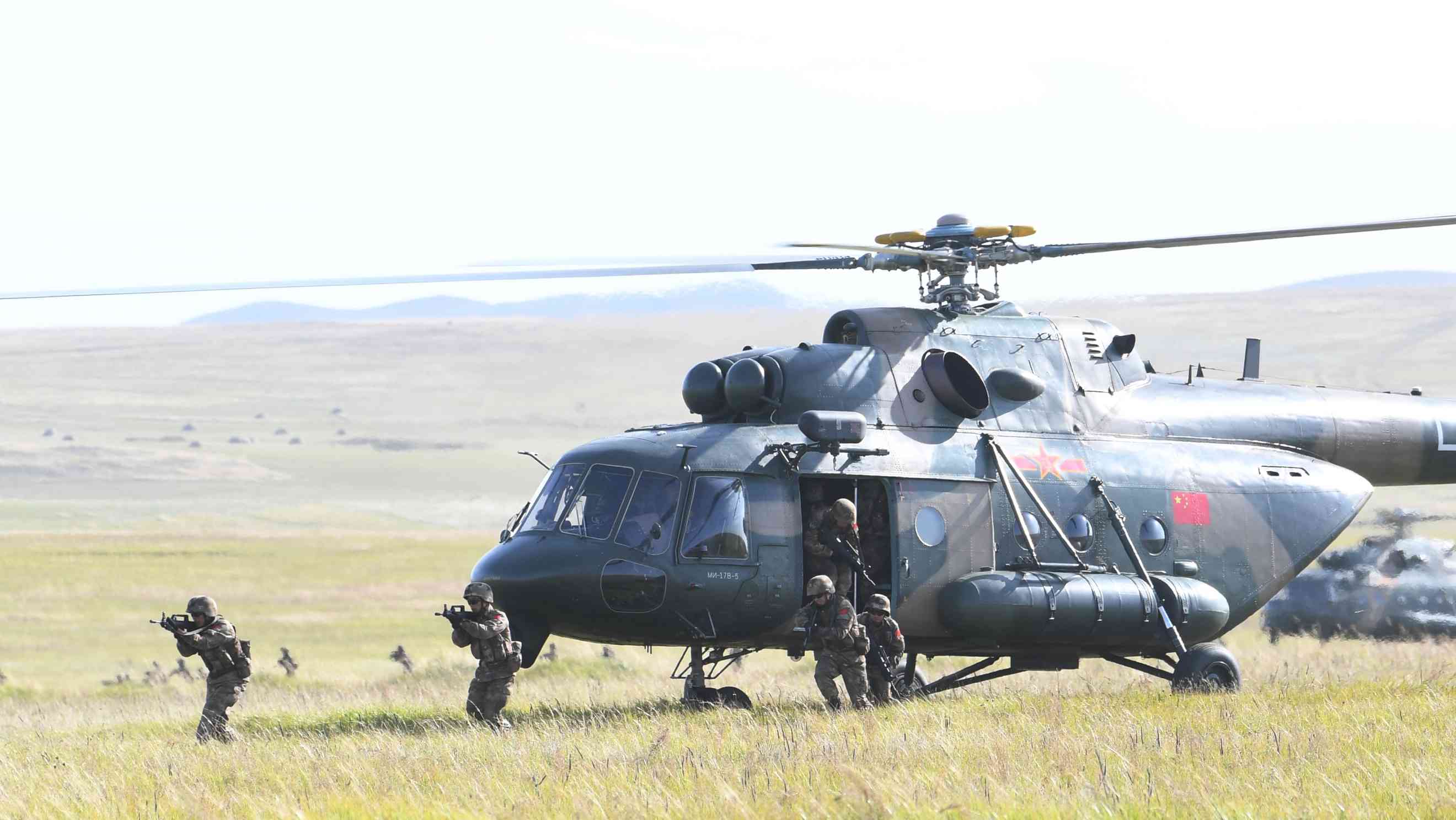 As part of daily training at the Tsugol Training Range, Chinese armed helicopters and bomber-fighters cooperated with tanks and armored vehicles to strike enemy targets.