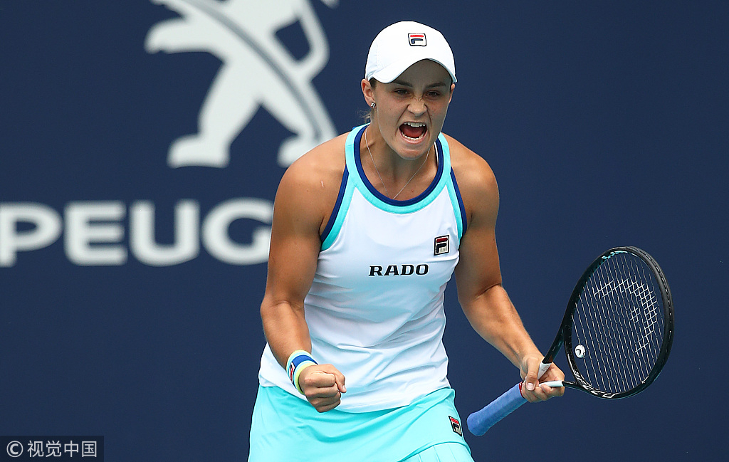 Ashleigh Barty of Australia celebrates at match point in the final of the Miami Open tennis match in Miami Gardens, Florida, U.S., March 30, 2019. /VCG Photo