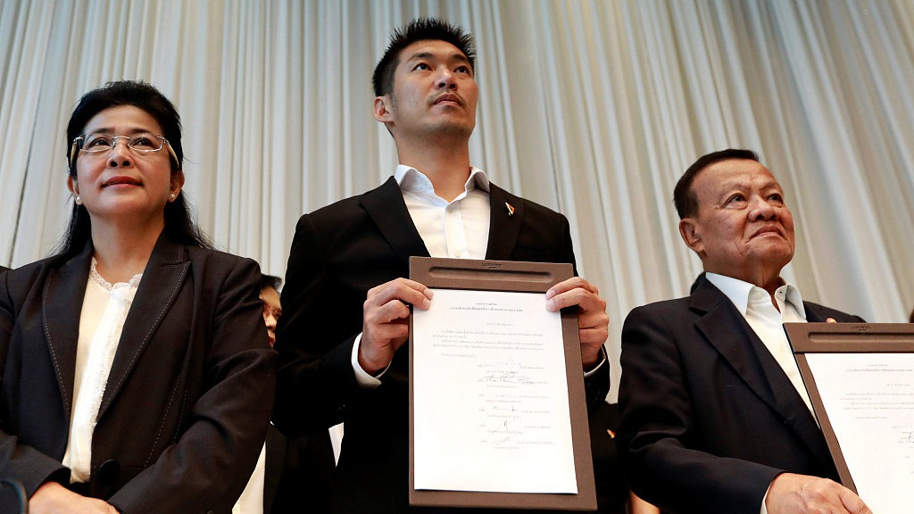 (Cover: Sudarat Keyuraphan (L), Pheu Thai Party's prime ministerial candidate, Thanathorn Juangroongruangkit (C), leader of the Future Forward Party, and leaders of other parties hold up agreements during a news conference to form a "democratic front" in Bangkok, Thailand, March 27, 2019. /VCG Photo)