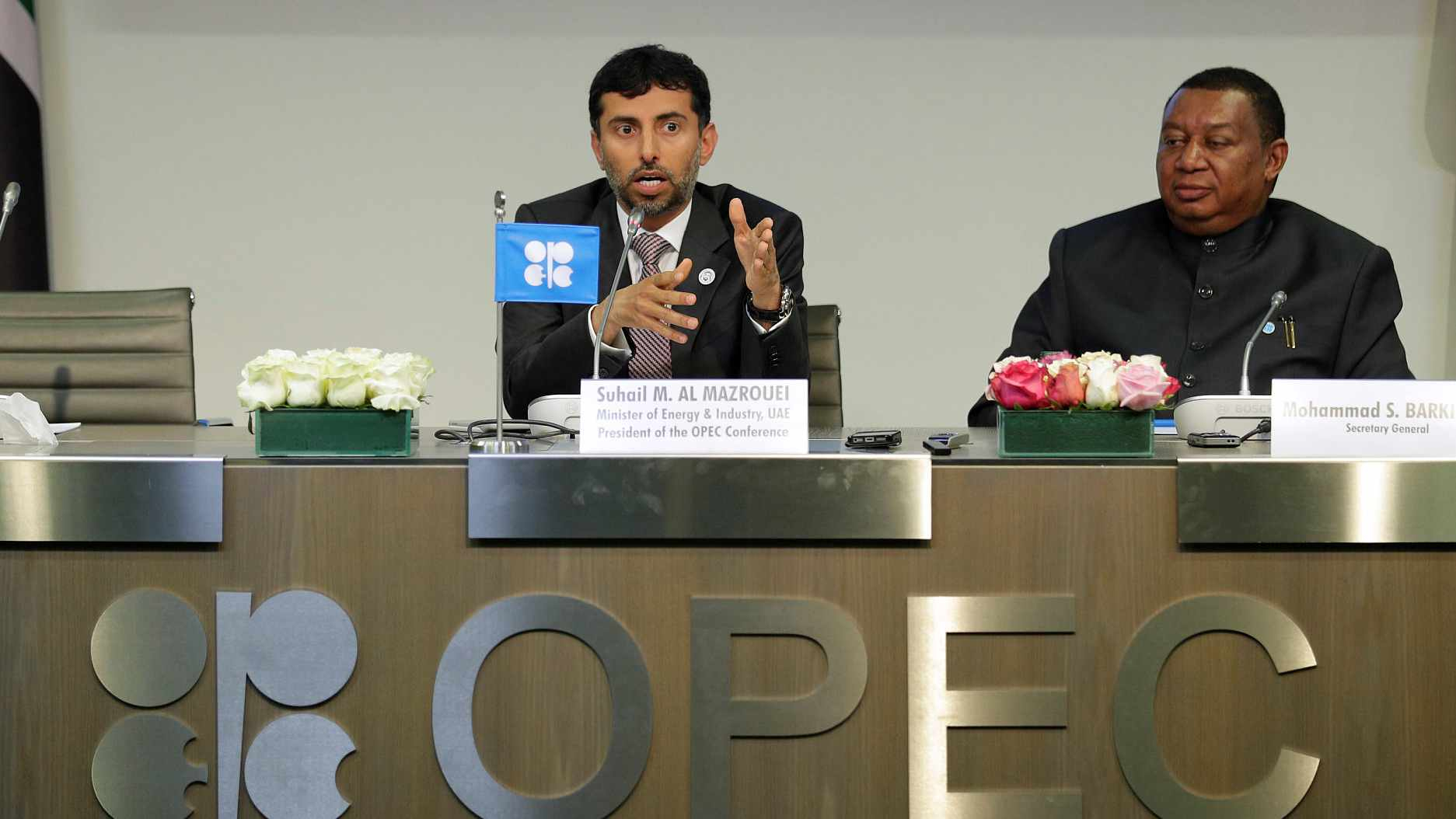 UAE's Oil Minister OPEC President Suhail Mohamed Al Mazrouei and OPEC Secretary General Mohammad Barkindo address a news conference after an OPEC meeting in Vienna, Austria, June 22, 2018. /VCG Photo
