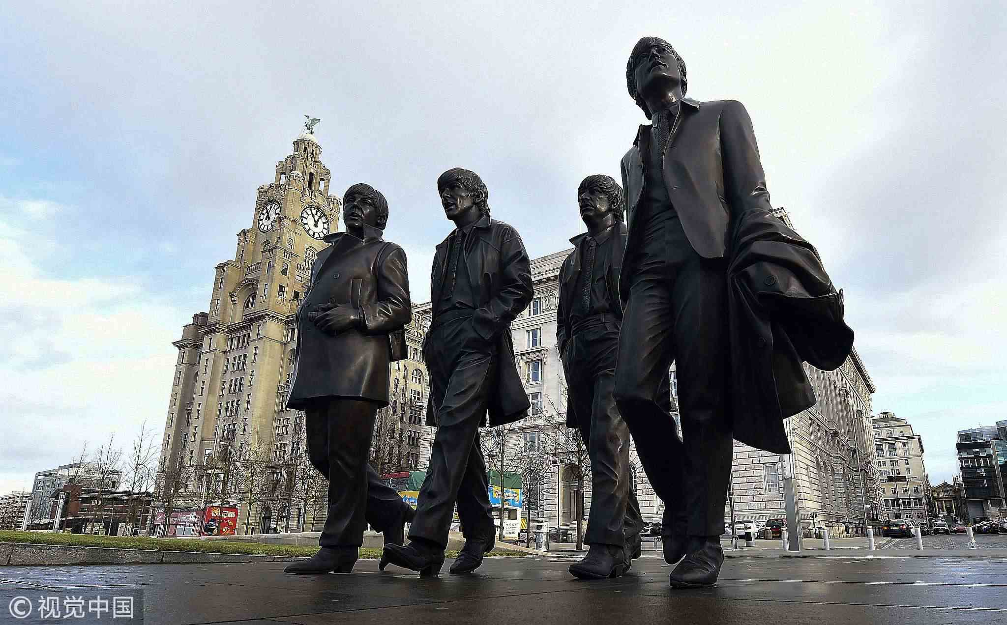 A picture shows a statue of British band The Beatles, featuring (L-R) musicians Paul McCartney, George Harrison, Ringo Starr and John Lennon, created by sculptor Andy Edwards and unveiled in Liverpool, north-west England on December 4, 2015, fifty years after their final performance in the city. /VCG Photo