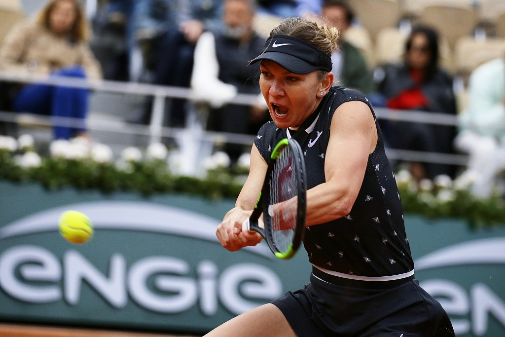 Romania's Simona Halep gives a powerful shot against Australia's Ajla Tomljanovic during their French Open match at Roland Garros in Paris, France, May 28, 2019. /VCG Photo