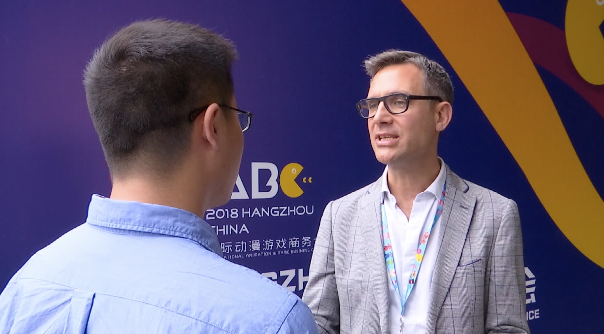 Olivier Dumont (R) is the managing director of Entertainment One (eOne) Family, the company behind Peppa Pig. /CGTN Photo