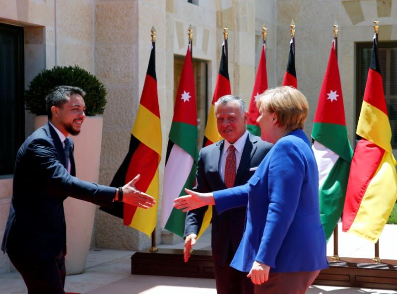 German Chancellor Angela Merkel shakes hands with Crown Prince Hussein at the Royal Palace in Amman, Jordan, June 21, 2018. /Reuters Photo