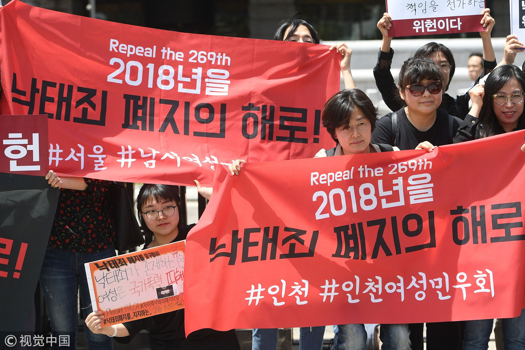 South Korean pro-choice supporters hold banners reading 'Decriminalize abortions' during a rally in front of the Constitutional Court in Seoul, May 24, 2018. /VCG Photo