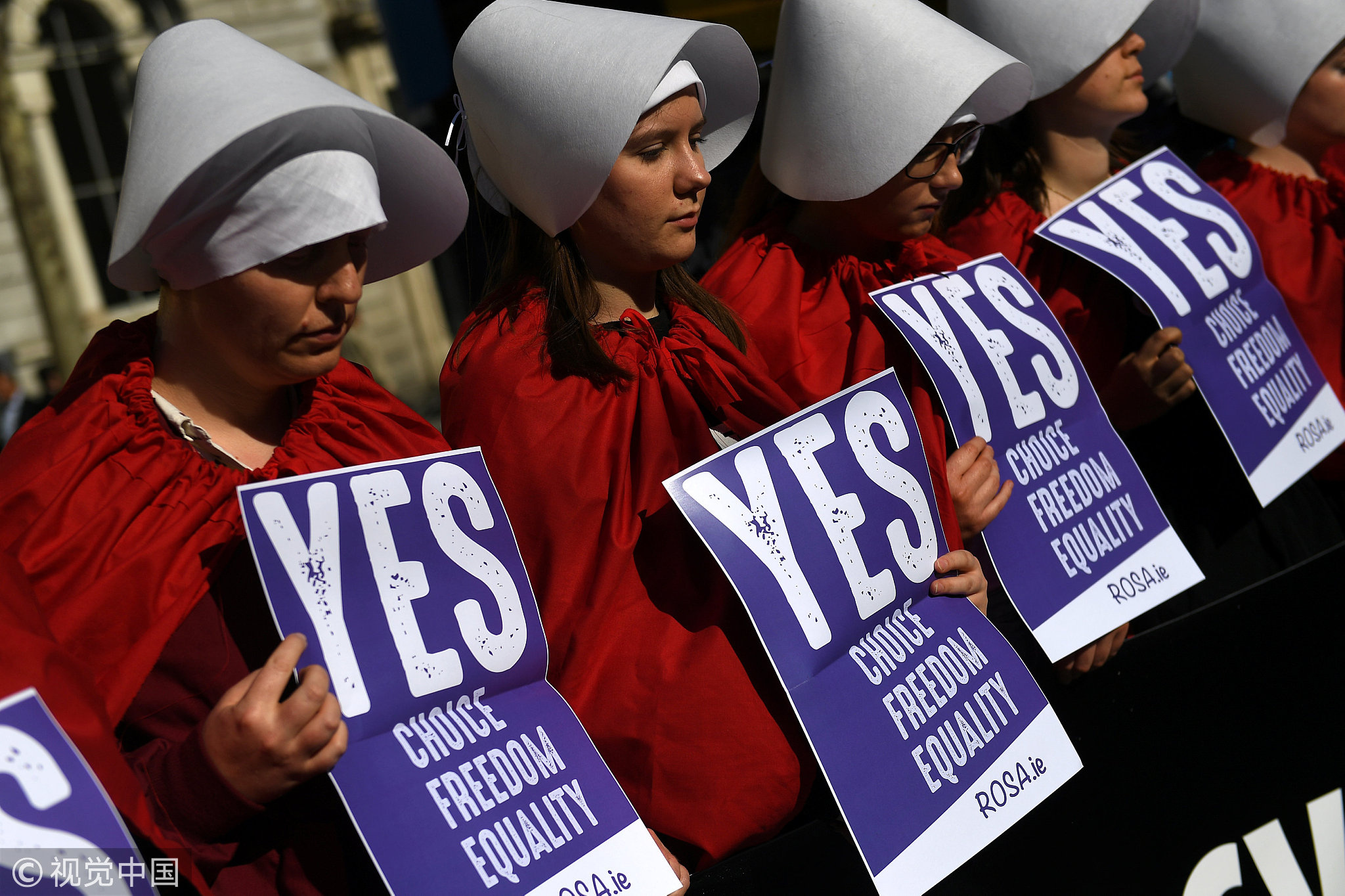 Pro-choice activists dress up as characters from the Handmaid's Tale in Dublin, Ireland, May 23, 2018. /VCG Photo