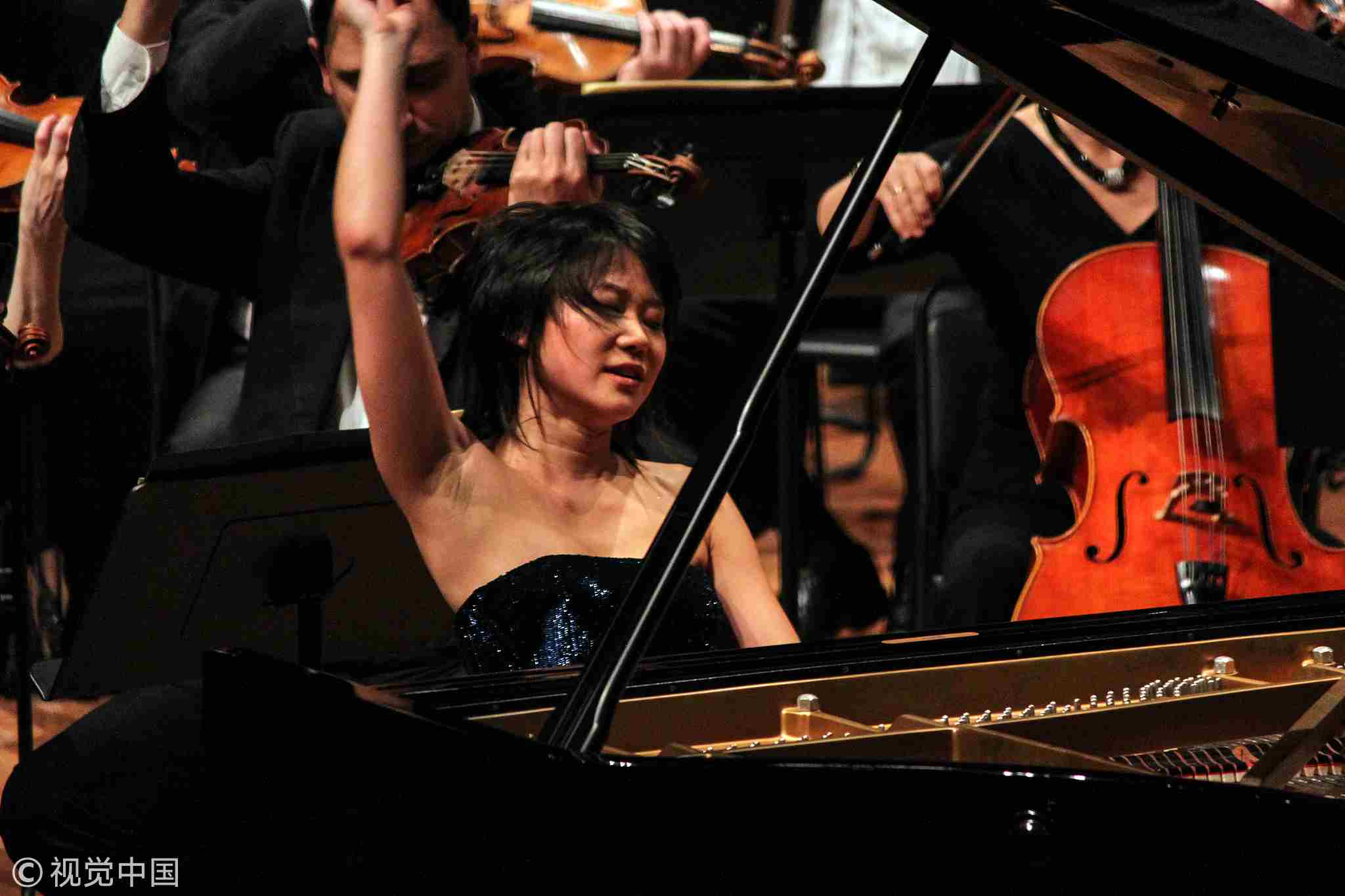 March 12, 2014: Beijing-born pianist Wang Yujia performs with London Symphony Orchestra in Guangzhou, south China's Guangdong Province. /VCG Photo