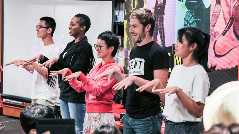 Cast dance with audiences at a fan meeting event in Beijing, China, June 20, 2018. /JUCOO Photo