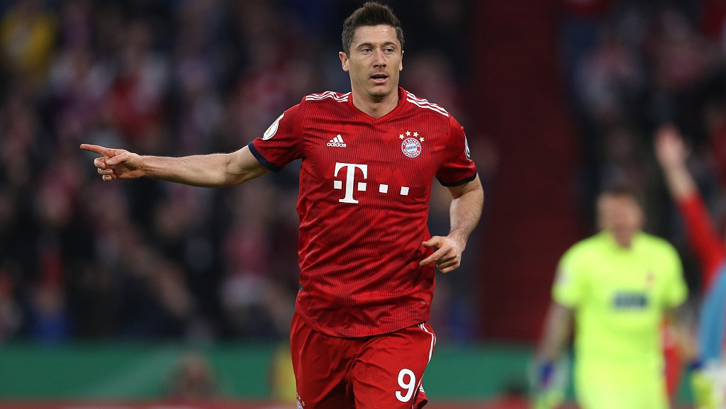 Thomas Mueller (R) of FC Bayern Muenchen celebrates his first goal with Robert Lewandowski during the DFB Cup quarter-final in Munich, Germany, April 3, 2019. /VCG Photo