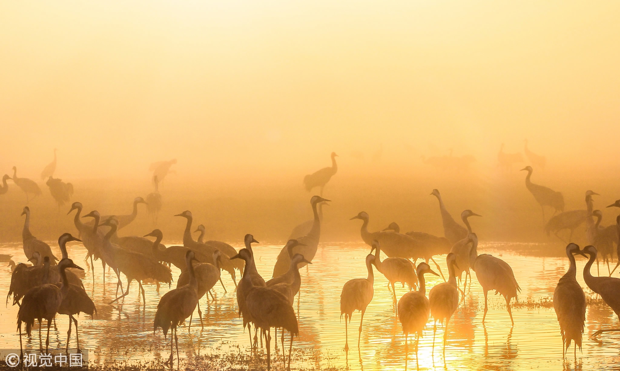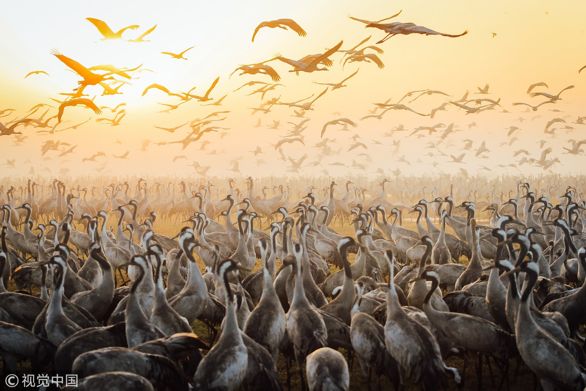 Almost 40,000 cranes spread for miles, with many silhouetted against the sun as it sets in the background of these incredible pictures. /VCG Photo