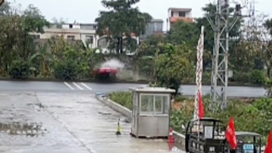 Footage shows a car losing control and crashing into a biker on a rainy street. The driver was trying to overtake the motorcycle when her feet slipped and accidentally stepped on the accelerator. The biker was sent to the hospital for treatment. Details of the accident are still being investigated.