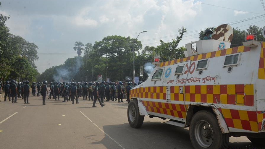 Police and an armored vehicle are seen during a demonstration for road safety in Dhaka, August 6, 2018. /Xinhua Photo