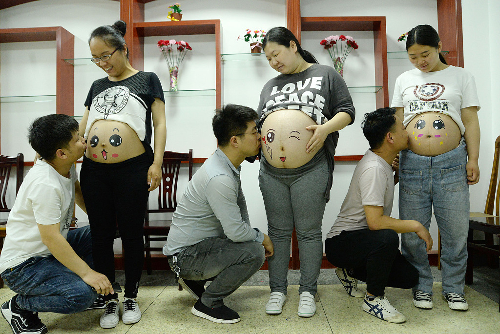 Fathers place emoji stickers on their pregnant wives’ bellies on Mother’s Day. /VCG Photo