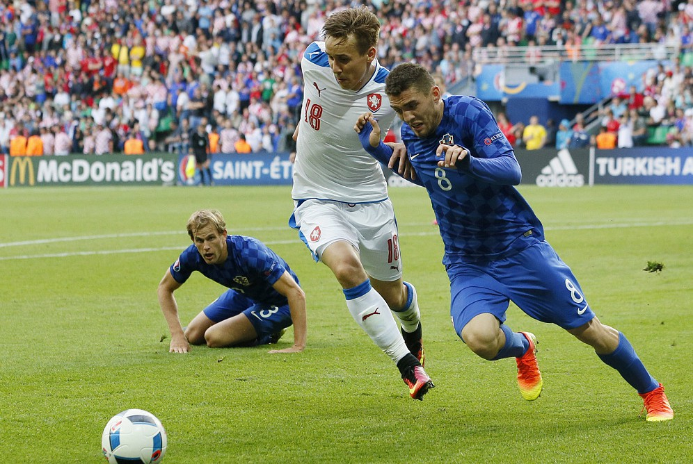 Czech Republic's Josef Sural (C) in action during the EURO 2016 clash with Croatia, June 17, 2016. /VCG Photo
