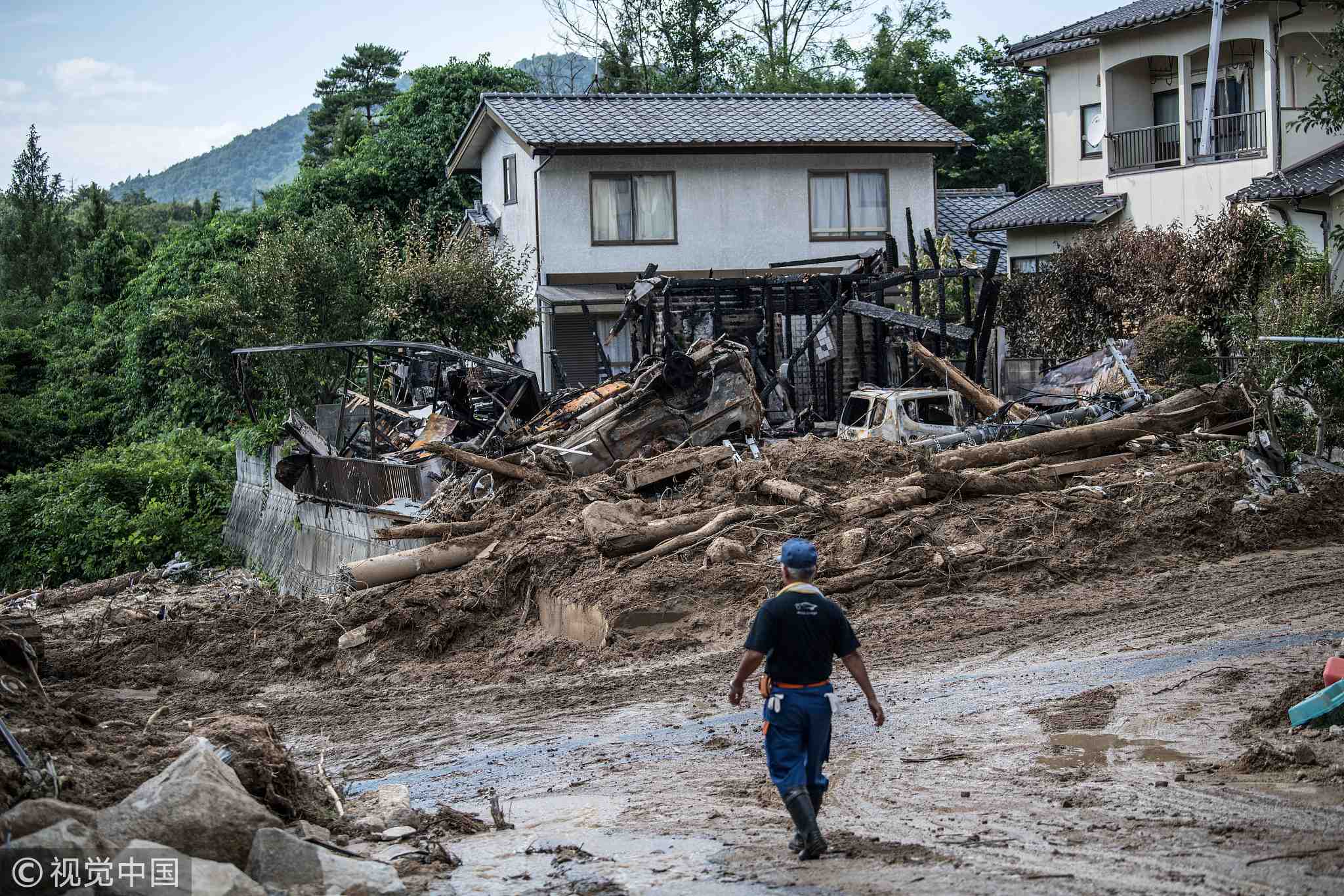A member of the emergency services walks past a house destroyed by a landslide near Hiroshima, Japan, July 8, 2018. /VCG Photo