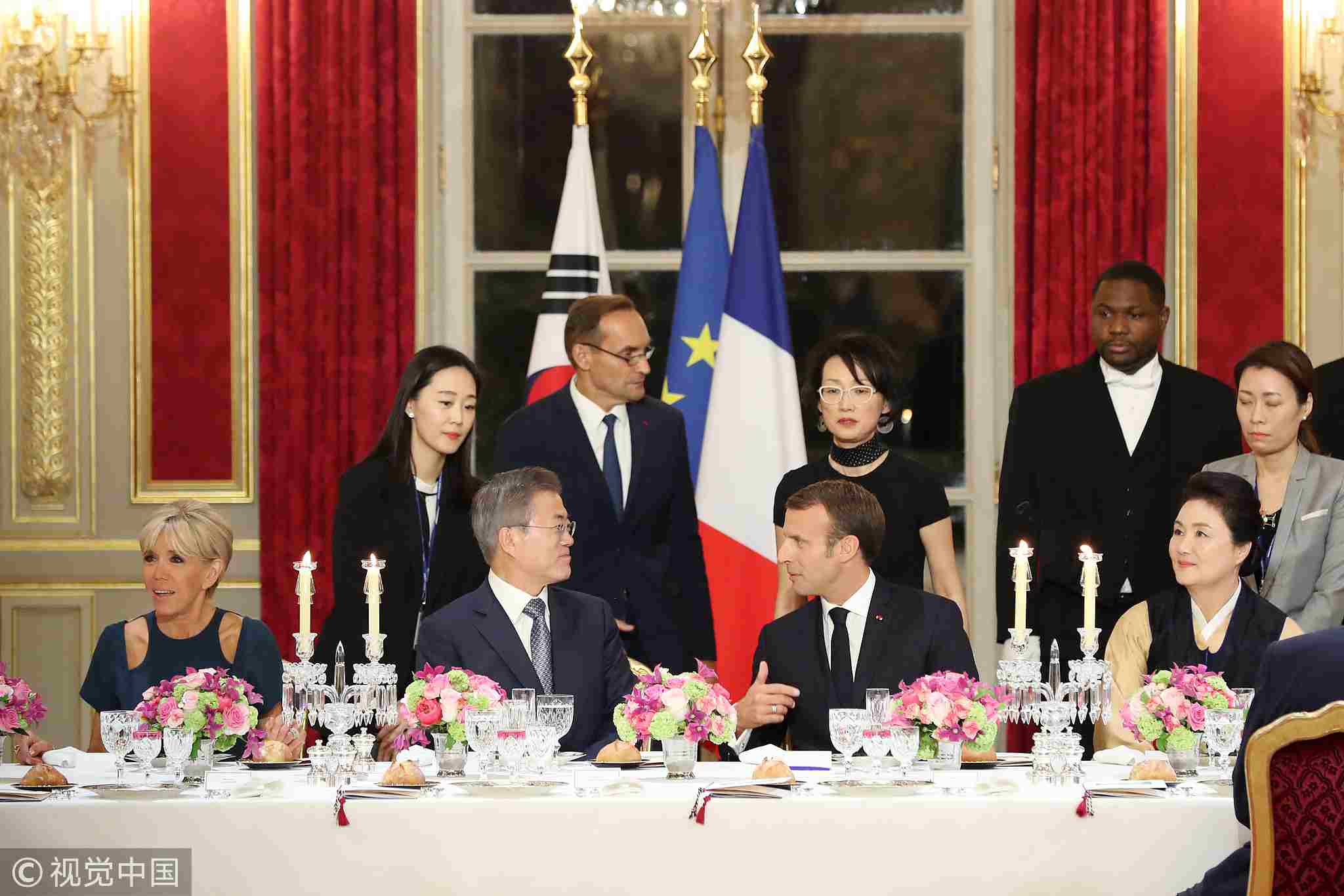 French President Emmanuel Macron talks to ROK President Moon Jae-in, along with France and ROK's first ladies Brigitte Macron and Kim Jung-sook at a state dinner at the Elysee Palace in Paris, France, October 15, 2018. /Reuters Photo