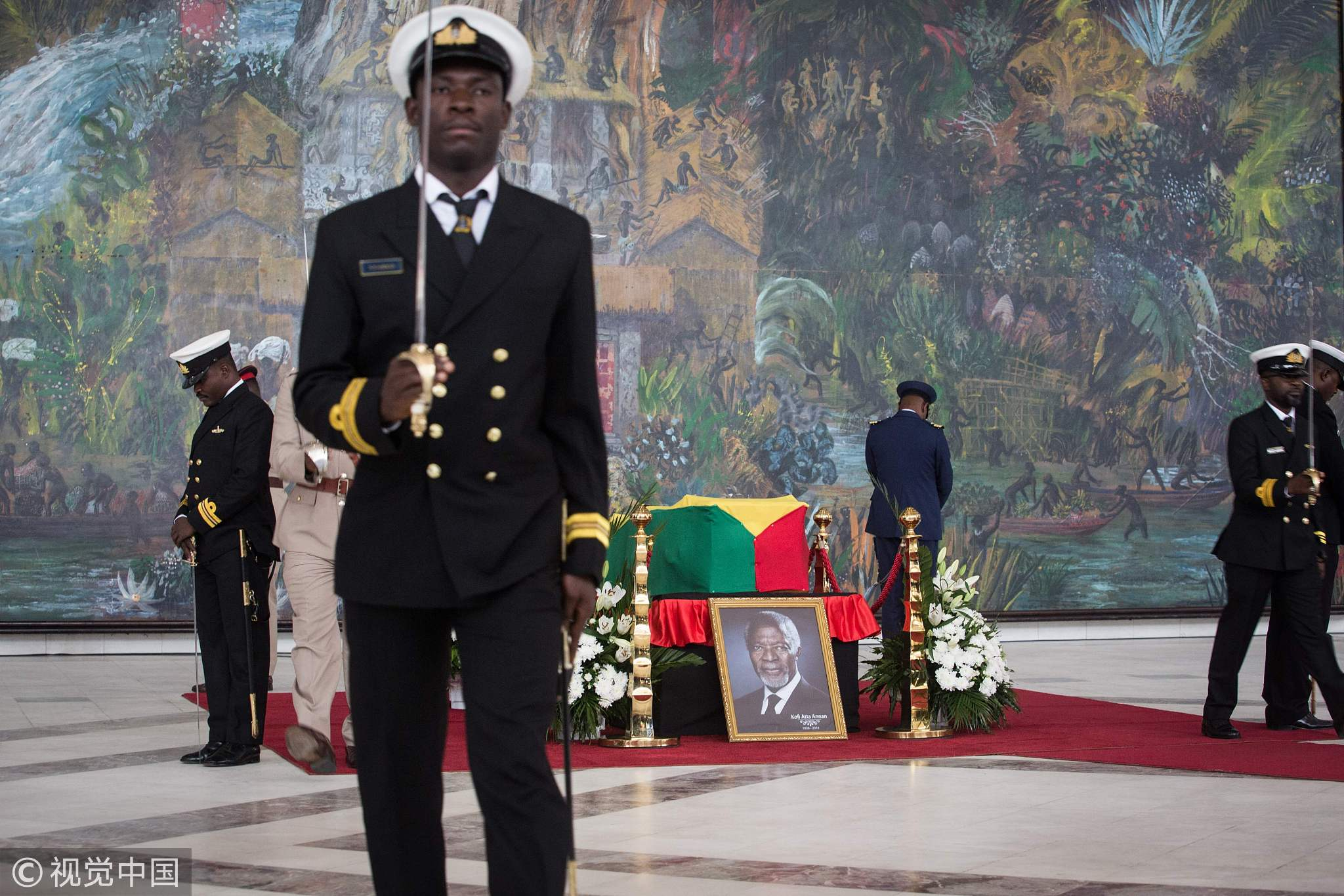 Militaries guard the coffin of Kofi Annan, Ghanaian diplomat and former Secretary-General of United Nations who died on August 18 at the age of 80 after a short illness, at the Accra International Conference Centre in Accra ahead of his funeral on September 12, 2018. / VCG Photo