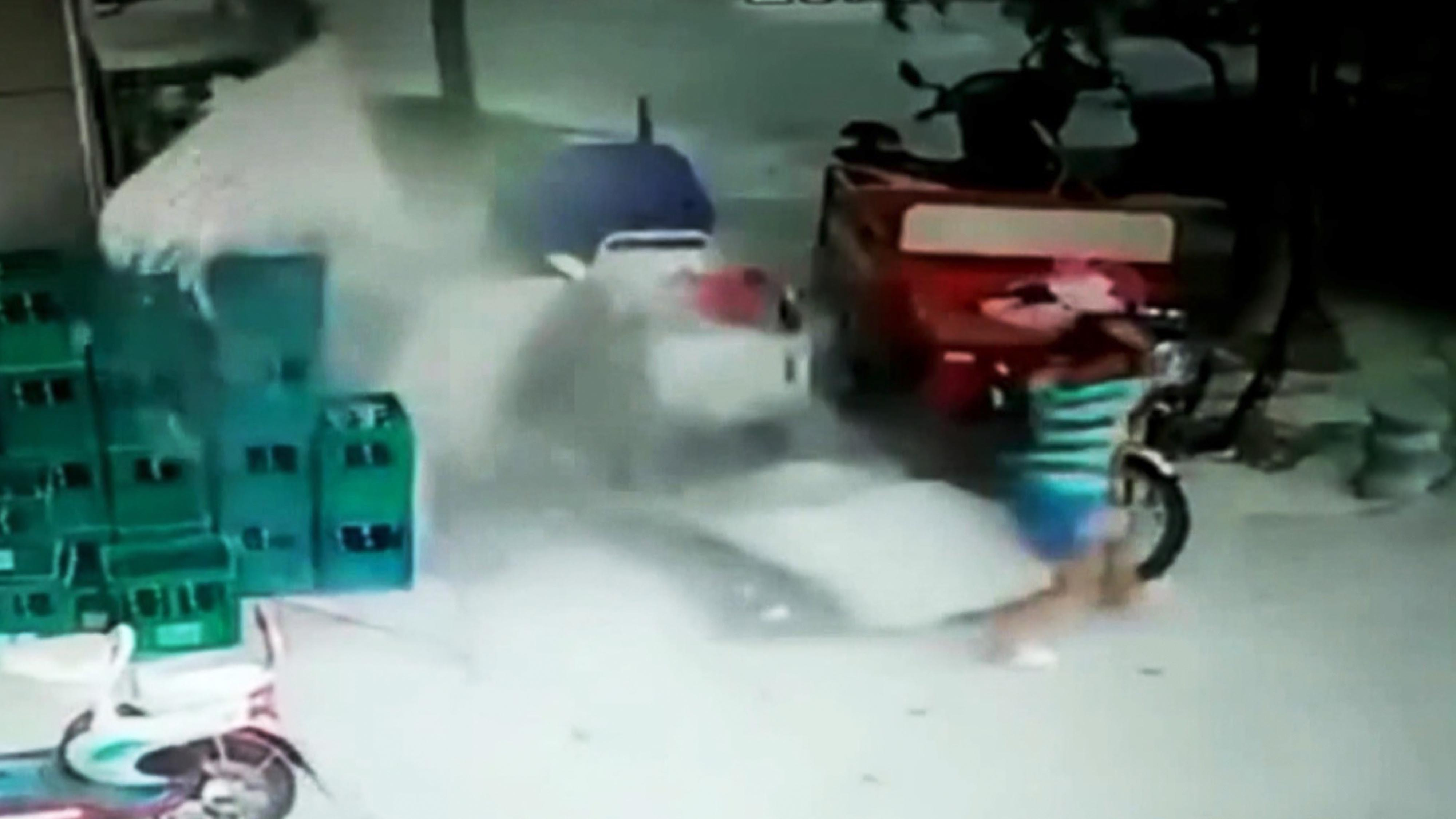 A boy avoided serious injury when falling pieces of wall from a residential building almost crushed him.