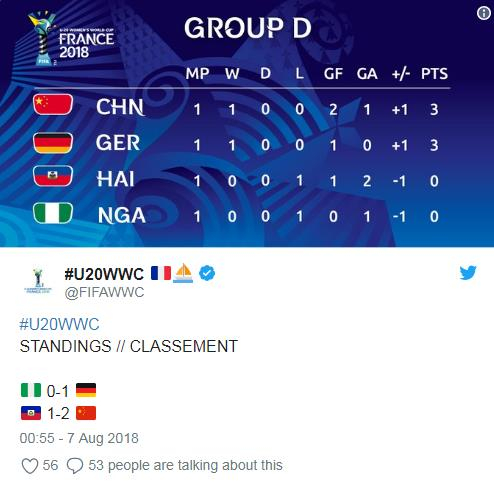 Ranking of Group D./Screenshot from U20 Women’s World Cup Twitter account