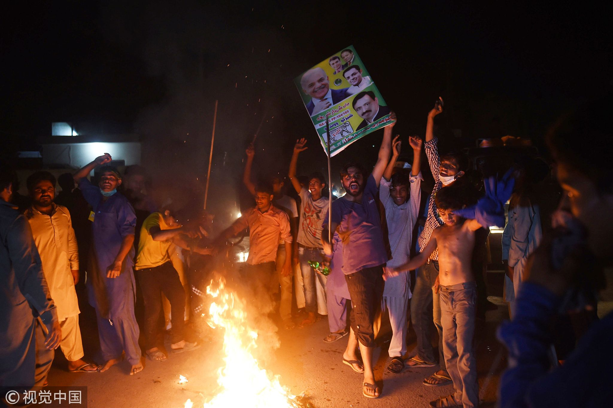 Supporters of former Pakistani Prime Minister Nawaz Sharif burn tyres during a protest ahead of the arrival of Nawaz from London, in a rally led by Shahbaz Sharif, Nawaz's younger brother and the head of the Pakistan Muslim League-Nawaz (PML-L) party, in Lahore on July 13, 2018. /VCG Photo