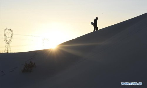 Doctor Liang Chunrong makes his way up a sand dune, January 25, 2018. /Xinhua Photo