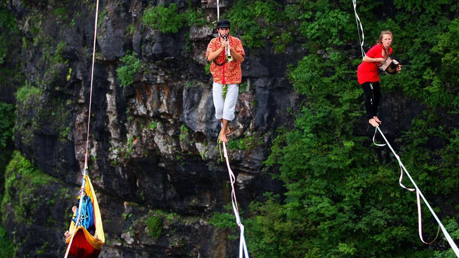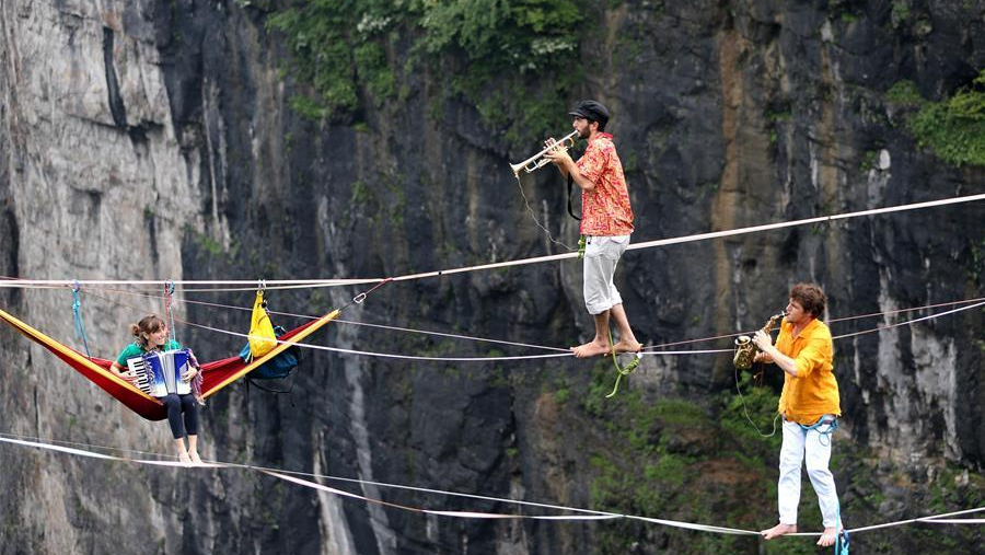 Combining extreme sports with music performance, the artists turned slacklines and slings into their stage while blowing trumpets, playing the accordion and beating the drum. /Xinhua Photo