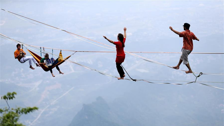 The slacklines were strung hundreds of meters above the ground. /Xinhua Photo