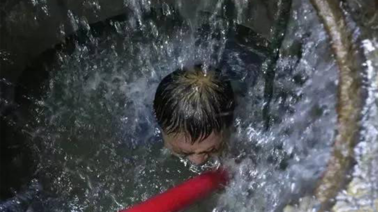 A fire hydrant was broken and spewed up a water column about four or five meters high on a road in Zhengzhou City, central China’s Henan Province on Thursday. A maintenance worker dove for 23 minutes underwater to close the valve.