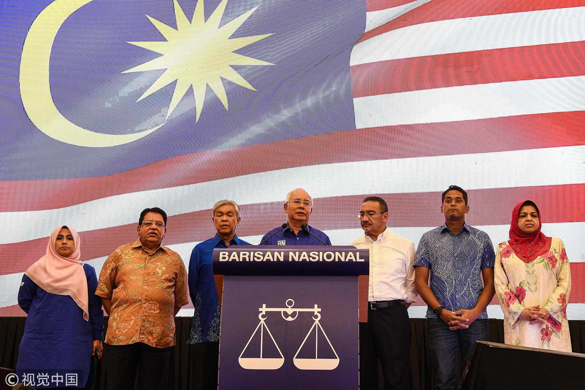 Outgoing Malaysian prime minister Najib Razak (C) of the Barisan National party addresses the media after his party lost the 14th general election in Kuala Lumpur on May 10, 2018. /VCG Photo