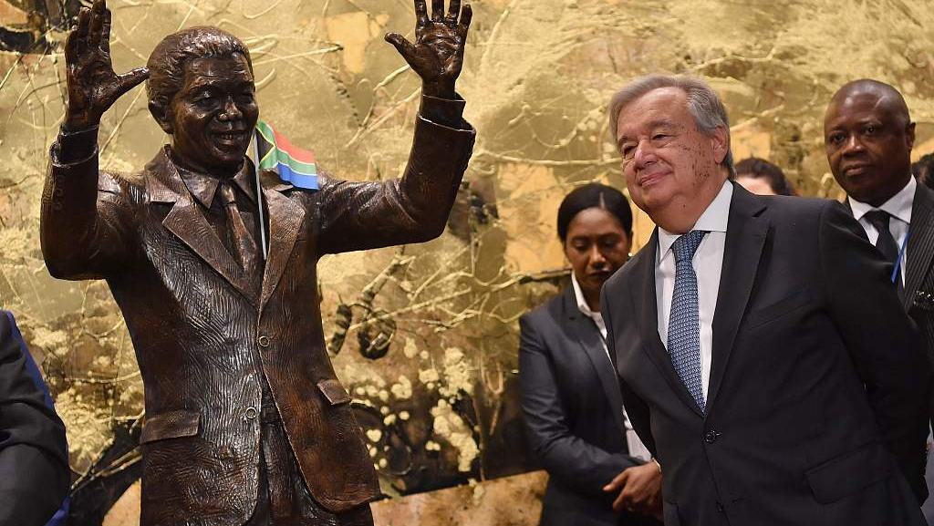 United Nations Secretary-General Antonio Guterres speaks at an unveiling ceremony of the Nelson Mandela statue from the Republic of South Africa, United Nations, in New York, September 24, 2018. Nelson Mandela is the founder of The Elders. /VCG Photo