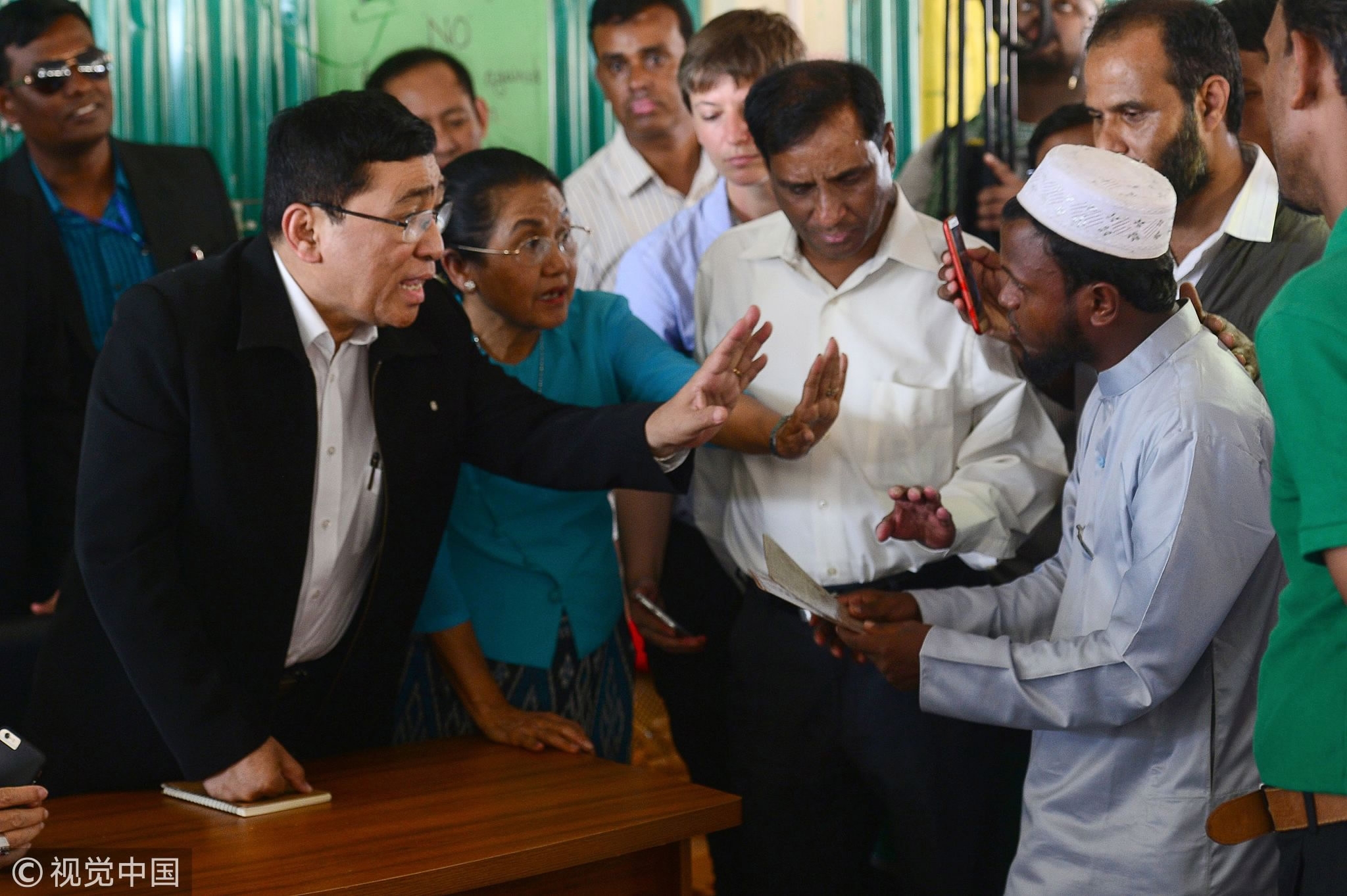 Myanmar Social Welfare Minister Win Myat Aye (L) talks to Rohingya refugees during his visit to the Kutupalong refugee camp in Bangladesh's Ukhia district on April 11, 2018. /VCG Photo