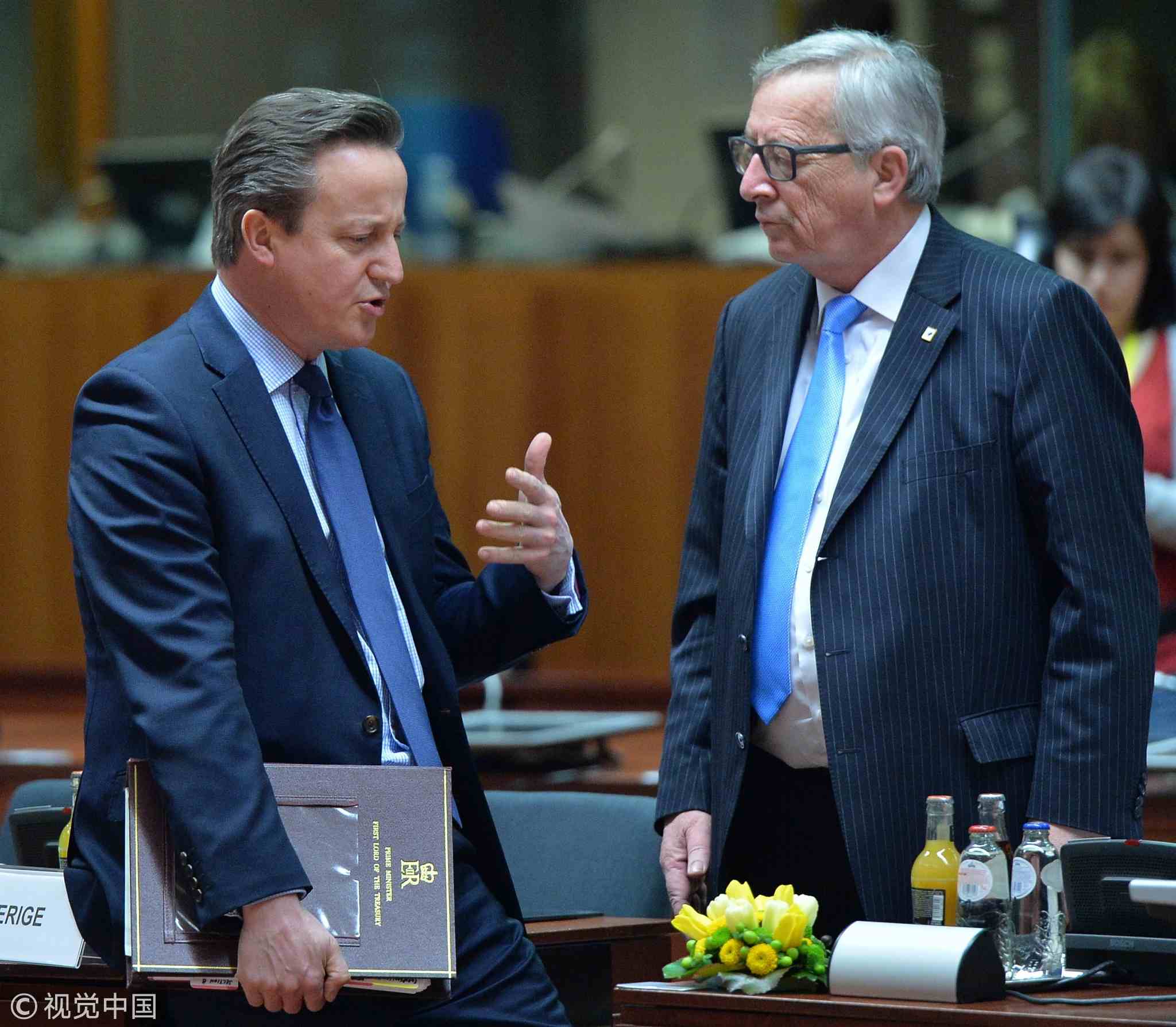 President of the European Commission Jean-Claude Juncker (R) and former British Prime Minister David Cameron (L) talk together during European Union (EU) Summit in Brussels, Belgium, on March 17, 2016. /VCG Photo