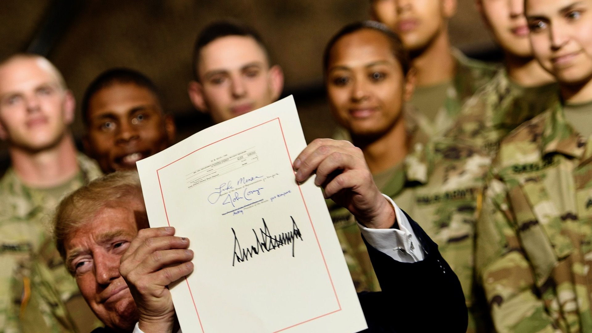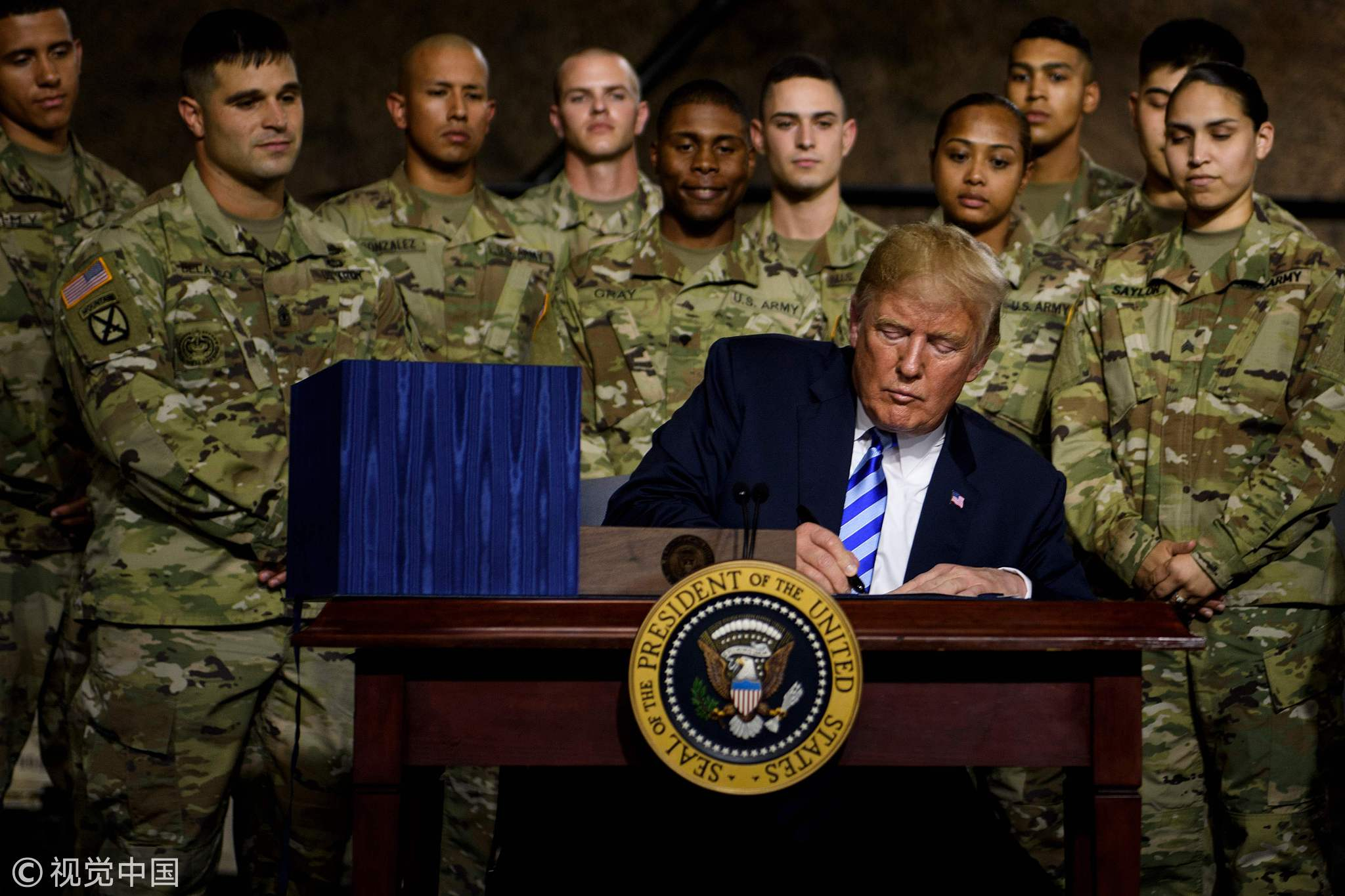 US President Donald Trump signs the “John S. McCain National Defense Authorization Act for Fiscal Year 2019” at Fort Drum, New York, on August 13, 2018. /VCG Photo