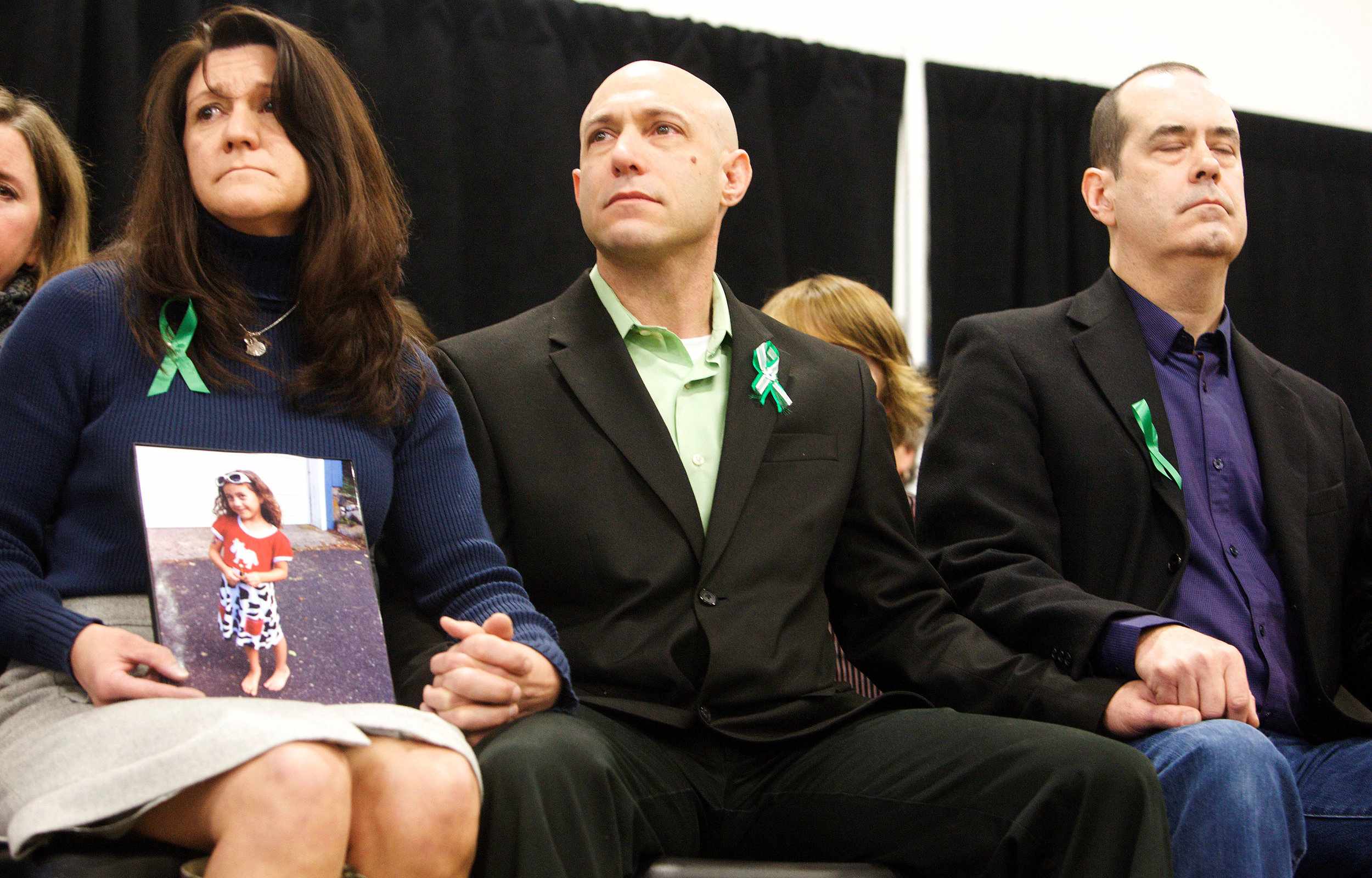 Jeremy Richman (C) and his wife Jennifer Hensel (L) attend the launch of Sandy Hook Promise, a non-profit created in response to the 2012 shooting that killed their six-year-old daughter, in Newtown, Connecticut, January 14, 2013. /VCG Photo